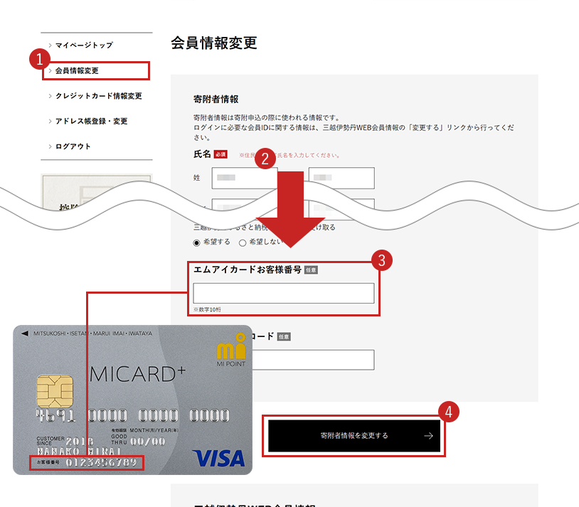 ① 三越伊勢丹ふるさと納税にログインし、マイページの「会員情報変更」から「エムアイカードお客様番号」欄に10桁のお客様番号を入力してください。