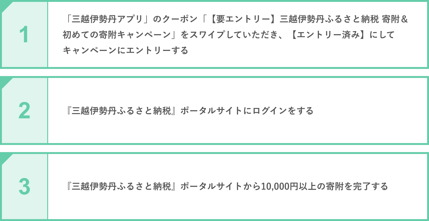三越伊勢丹アプリのクーポンページの「【要エントリー】三越伊勢丹ふるさと納税 寄附&初めての寄附キャンペーン」クーポンを【エントリー済です】にしてください。