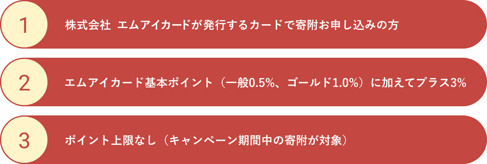 - (株)エムアイカードが発行するカード以外で寄附の決済をされた場合は、寄附お申し込み時に「エムアイカードお客様番号」の記載のあるなしに関わらず、本キャンペーンの対象外となります。