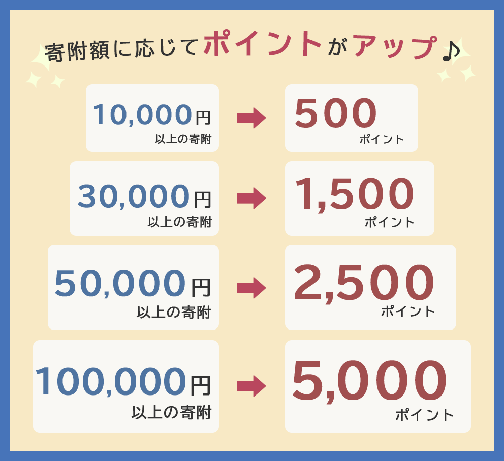 寄附金額 ポイント 10,000円~29,999円 500ポイント 30,000円~49,999円 1,500ポイント 50,000円~99,999円 2,500ポイント 100,000円以上 5,000ポイント