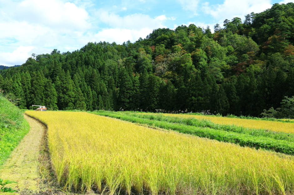 町の面積の70%以上を山林が占め、県下No.1の規模を誇る天然の広葉樹林。山奥に入ると川幅がグッと狭くなり、渓流にはヤマメが泳ぎます。山間の盆地で年間を通して気温差は35℃以上、稲が成熟する頃には昼夜の気温差が12℃を超える、寒暖の差が激しい土地でもあります。そこで人々は、先祖代々受け継いだ田んぼで汗水垂らして米作りに励み、雪に覆われる冬は静かに過ごしてきました。