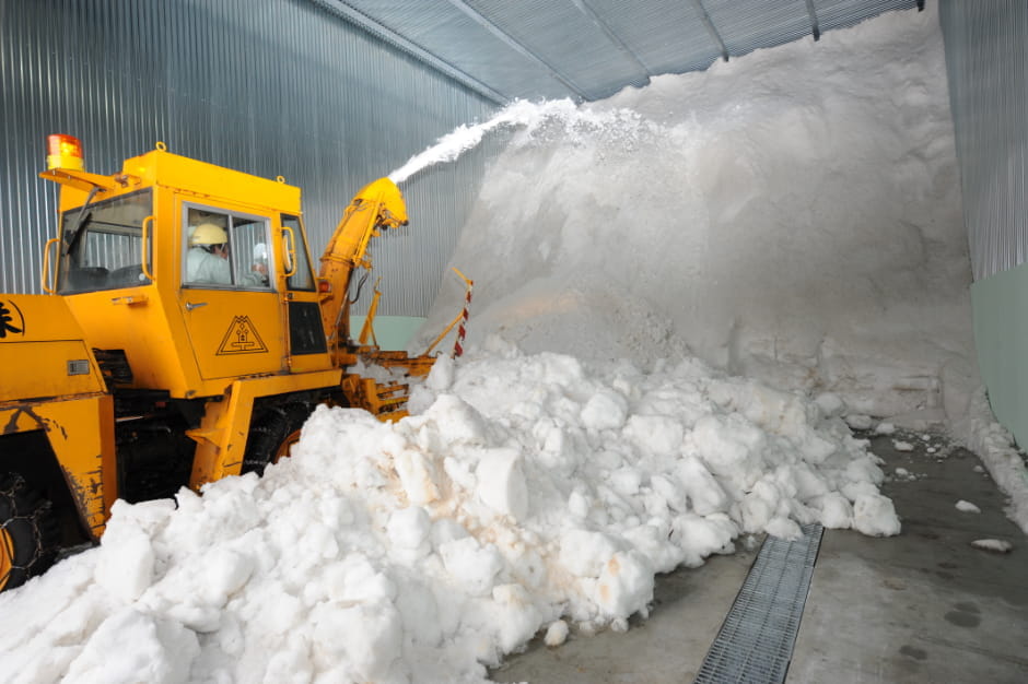 「雪だけ保管する部屋があって、工場の敷地に積もった雪を600tほど、ブルドーザーで入れています。部屋には断熱材を入れているので、真夏でも溶けないんですよ。この雪蔵の冷気を、天井のダクトを通して倉庫に運んでいます。電気の冷蔵庫では、米を置く場所によって温度にムラがでますが、雪で冷やすと1年中一定の温度を保てます。米は低温で保管することで、でんぷんを糖に変えて自身を守ろうとするので甘みが増します。さらに米の呼吸を抑えられるので米の劣化を防ぎ、害虫の繁殖も防げるんですよ」。