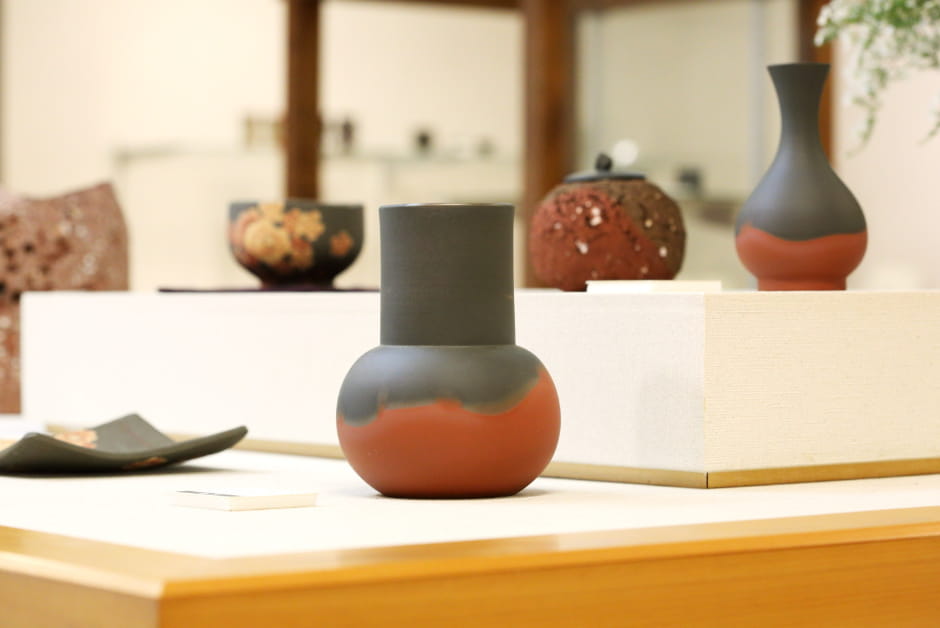 そのひとつが、“窯変(ようへん)”シリーズ。赤と黒のコントラスト、2色の境界線の絶妙な曖昧さが見る人を惹きつけます。無名異焼が黒くなるのは、炎が焼きものに直接触れてしまったから。