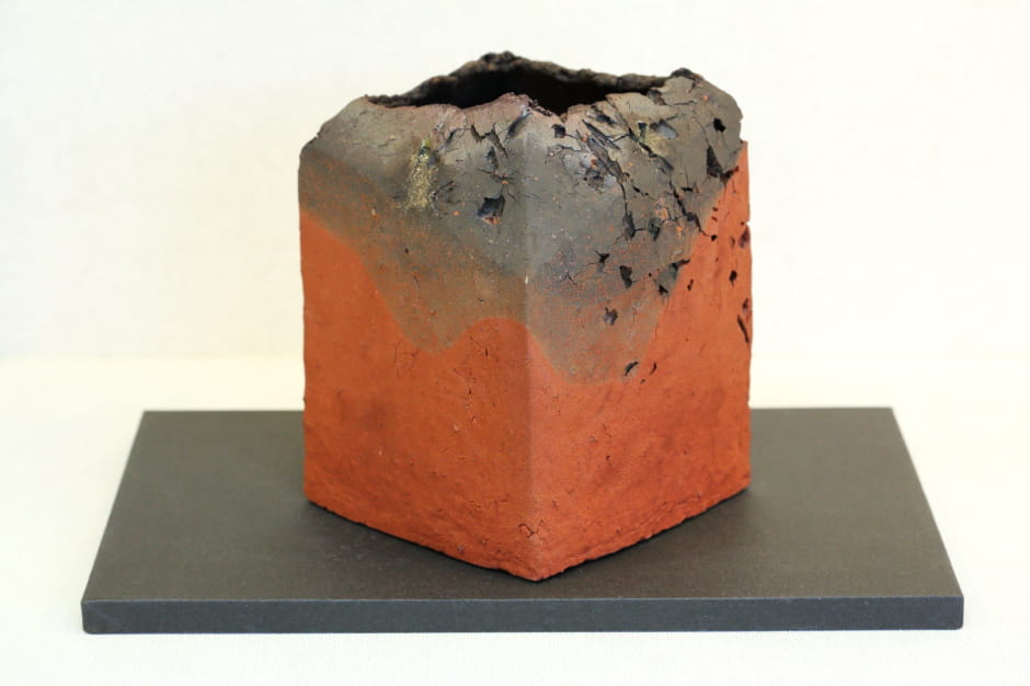 「岩石は種類によって溶ける温度も違うので、ものによっては凹凸ができたり、燃えてなくなって穴が開く部分もあります。器というより、立体物を作っているイメージですね。最近は造形が美しい陶器より、原始的なものからエネルギーを感じるようになりました。私も年老いて、あと何年続けられるかわかりません。そう考えると、やっかいなものは捨てて、何もかも自由になりたいと思いますね」。
