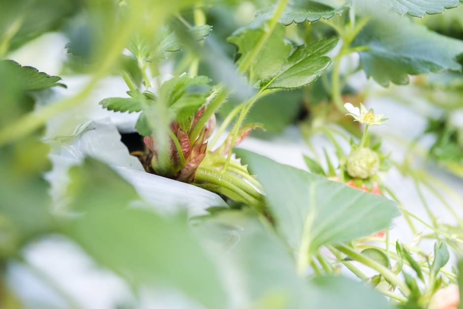 『苺の花ことば』のハウスに一歩入ると、目の前にはみずみずしいいちごの葉がずらっと並び、あちこちから真っ赤な『越後姫』や、淡いピンクの『桃薫』、可憐な白いいちごの花が顔をのぞかせています。