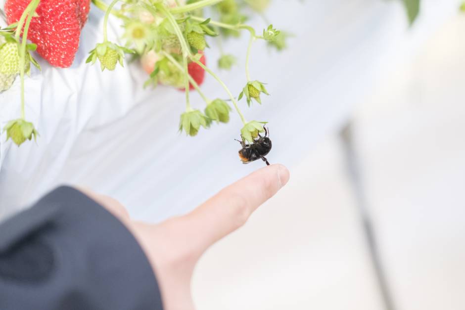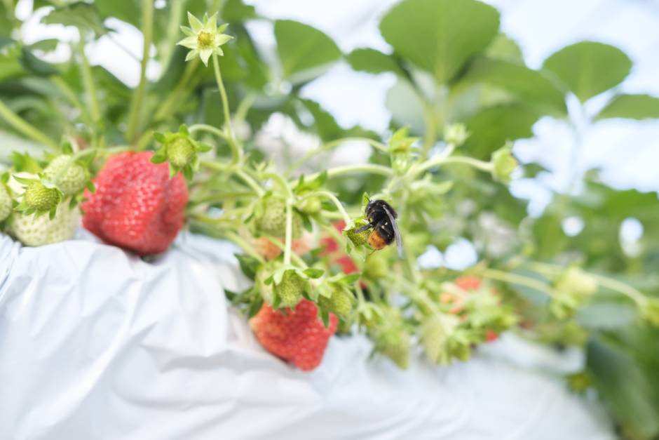 その間をクロマルハナバチは気ままに飛び交い、受粉し、てんとうむしはのんびりと葉の上を移動。そんな様子を見ていると、人工的なビニールハウスの中というよりも、森や林の中に、ふいに現れたいちご畑にいるような気がするほどです。