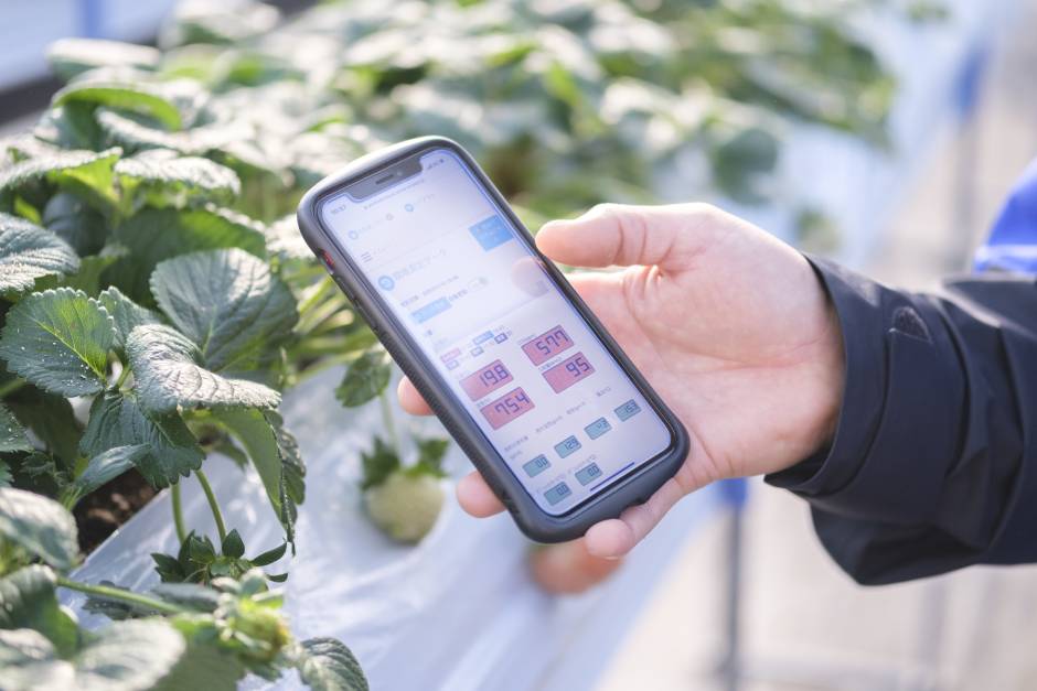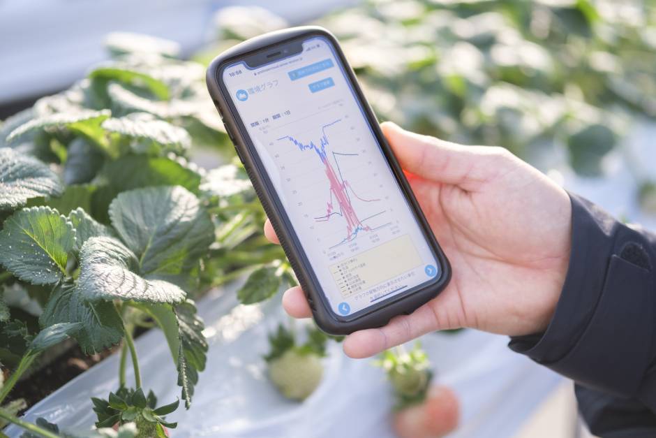 高橋さんは常に、ハウス内の環境データがグラフ化、数値化されたものをスマホでチェックしています。日射量やハウス内環境は刻一刻と変化しますのでハウスに足を運び、いちごに最適な環境になるようコントロールします。