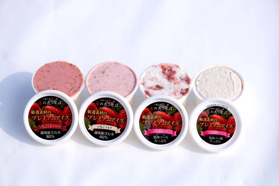 こだわったのは「いちご風味」ではなくて、いちごの味と香りがダイレクトにガツンと感じられること。その結果、『苺シャーベット』は『越後姫』の含有量80%、地元の三和牛乳のミルクを使ったアイスクリーム『苺ミルク』は『越後姫』の含有量60%とかなり濃厚な仕上がりに。三和牛乳のミルクは新潟県内で人気があり、レストランやお菓子屋さんでもよく使われています。