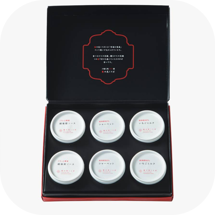 <苺の花ことば>という農家さんが、愛情込めて育てた完熟いちご「越後姫」でアイスを作りました。シャーベットやいちごミルクといった異なる風味の3種類で飽きずに楽しめます。これも、他では味わうことのできない素材の旨味を感じられる隠れた逸品です。