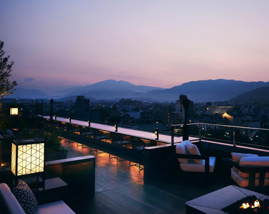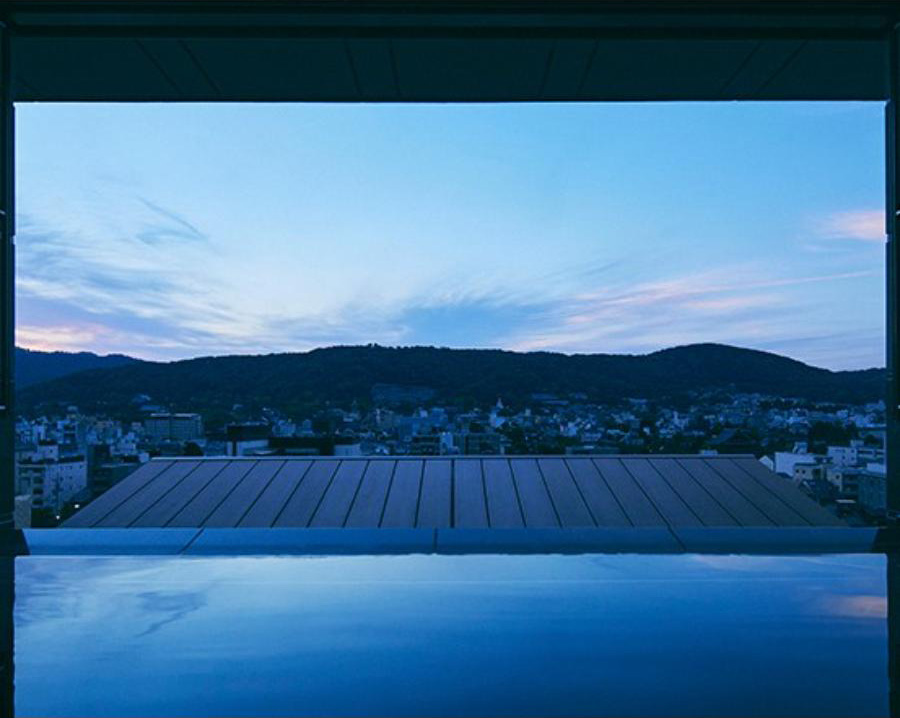 鴨川や東山を天空から望む「空庭テラス」と最上階にしつらえた天然自家源泉の露天風呂。