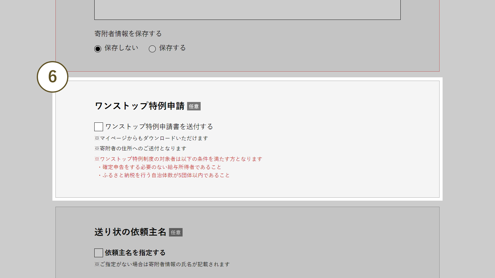 - 6 ワンストップ特例申請がご利用いただけるのは、寄附者1人あたり年間5自治体までとなっております。超えた場合は確定申告が必要になりますのでご注意ください。