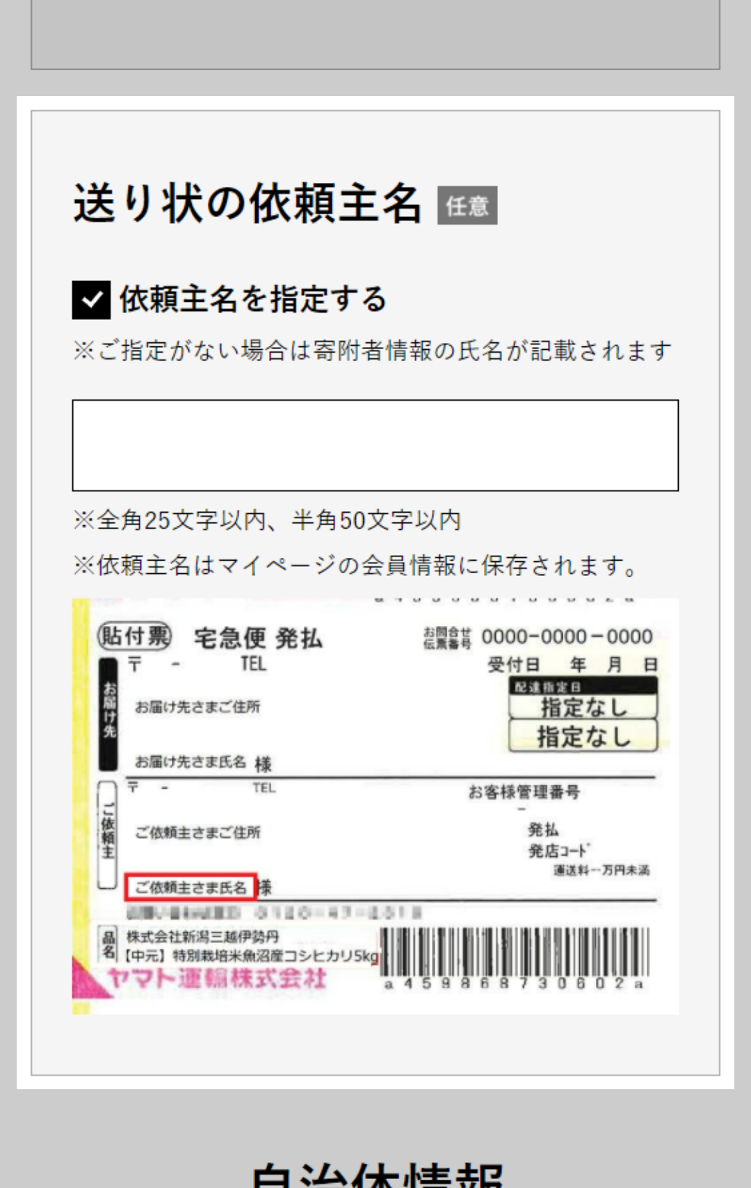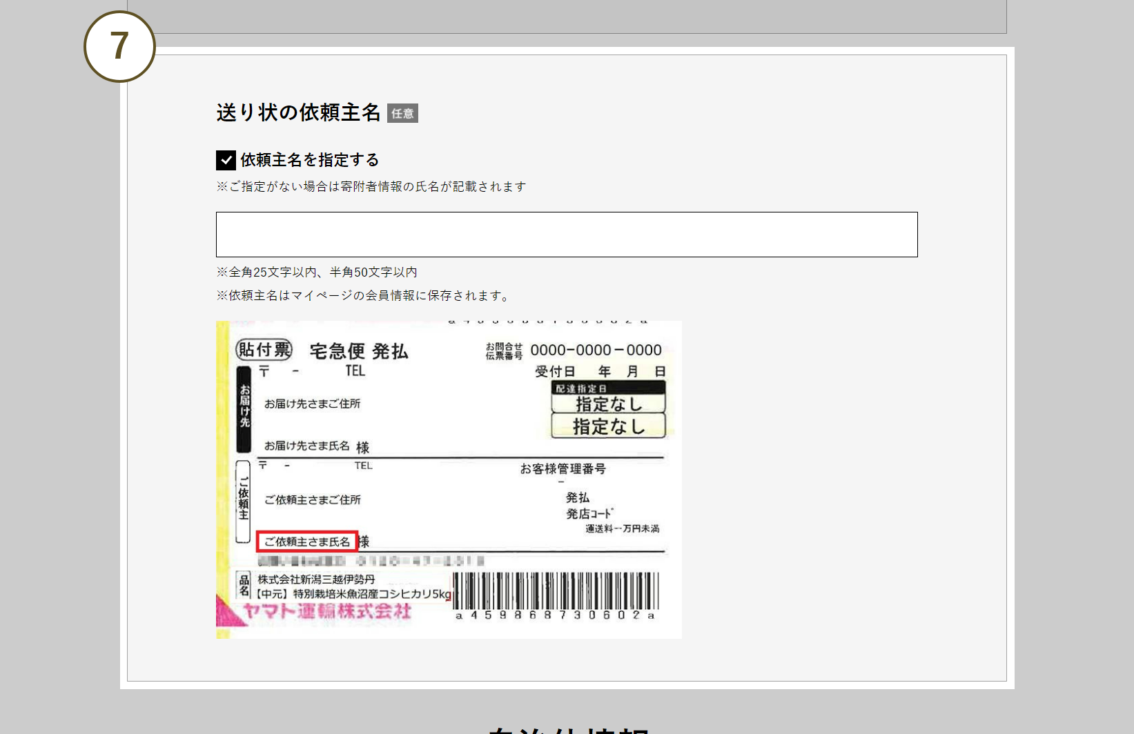 - 7 送り状の送り主名を変更したい場合は、「依頼主名を指定する」にチェックを入れ、表示されるフォームに依頼主名を入力してください。