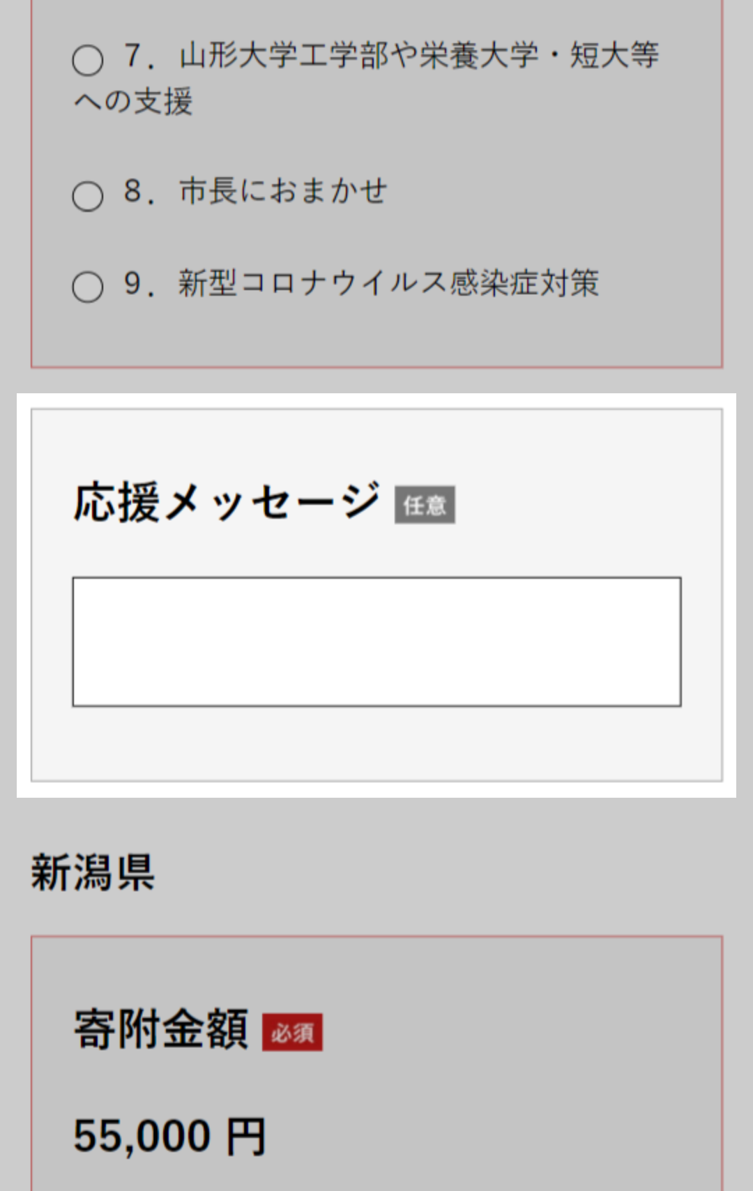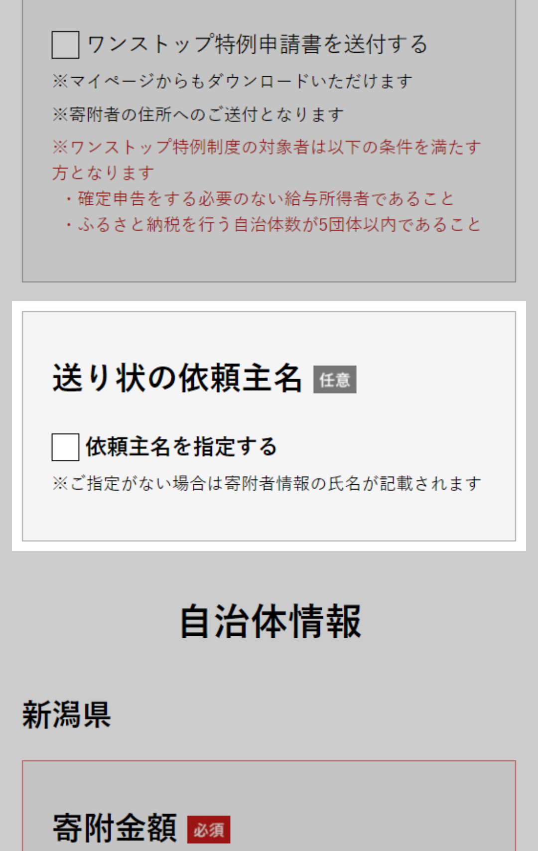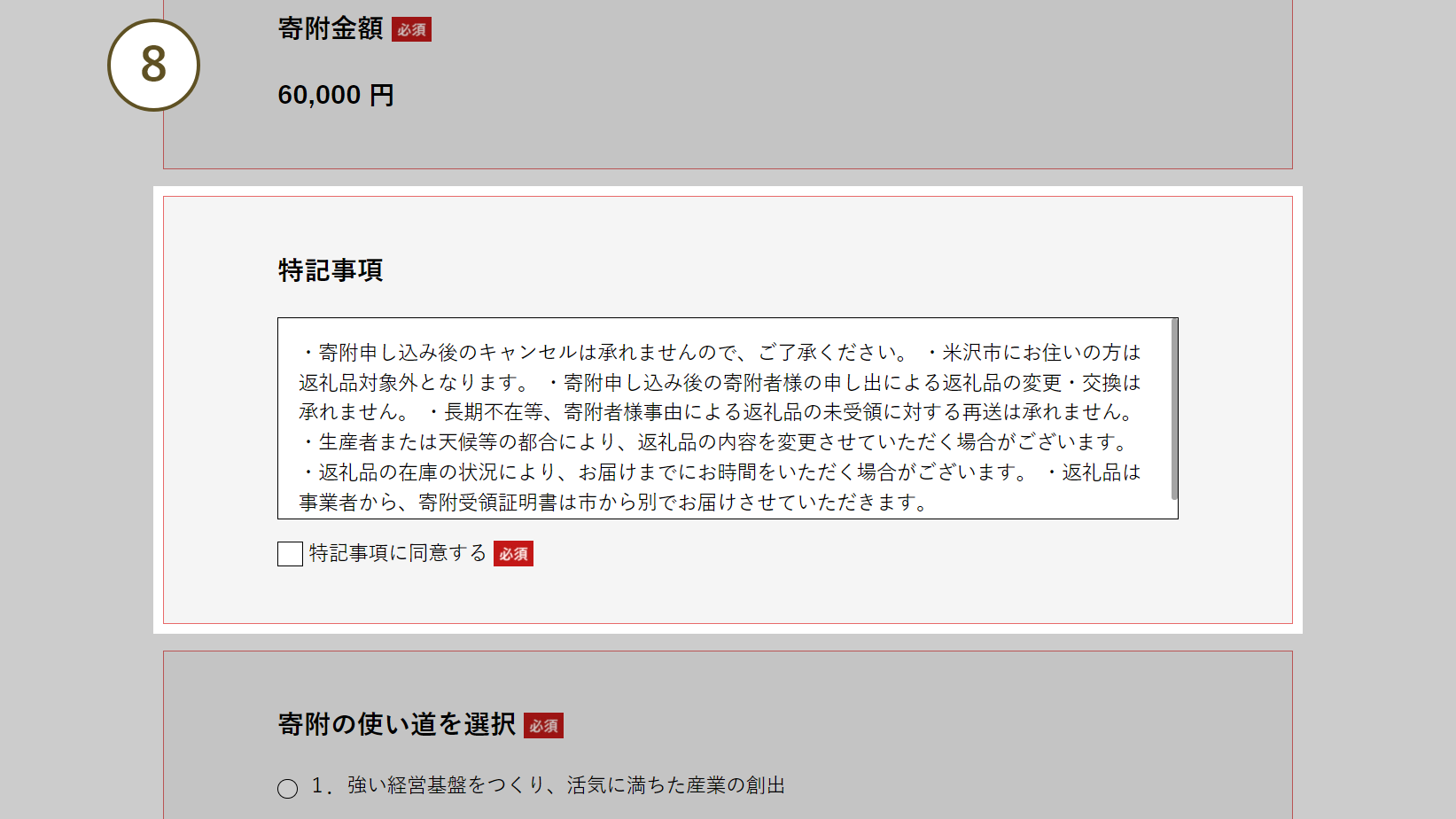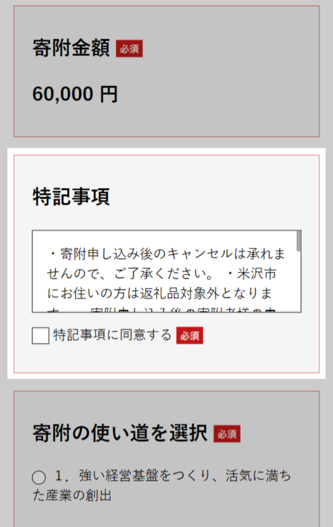 ※チェックが外れていると寄附申し込みされません。
