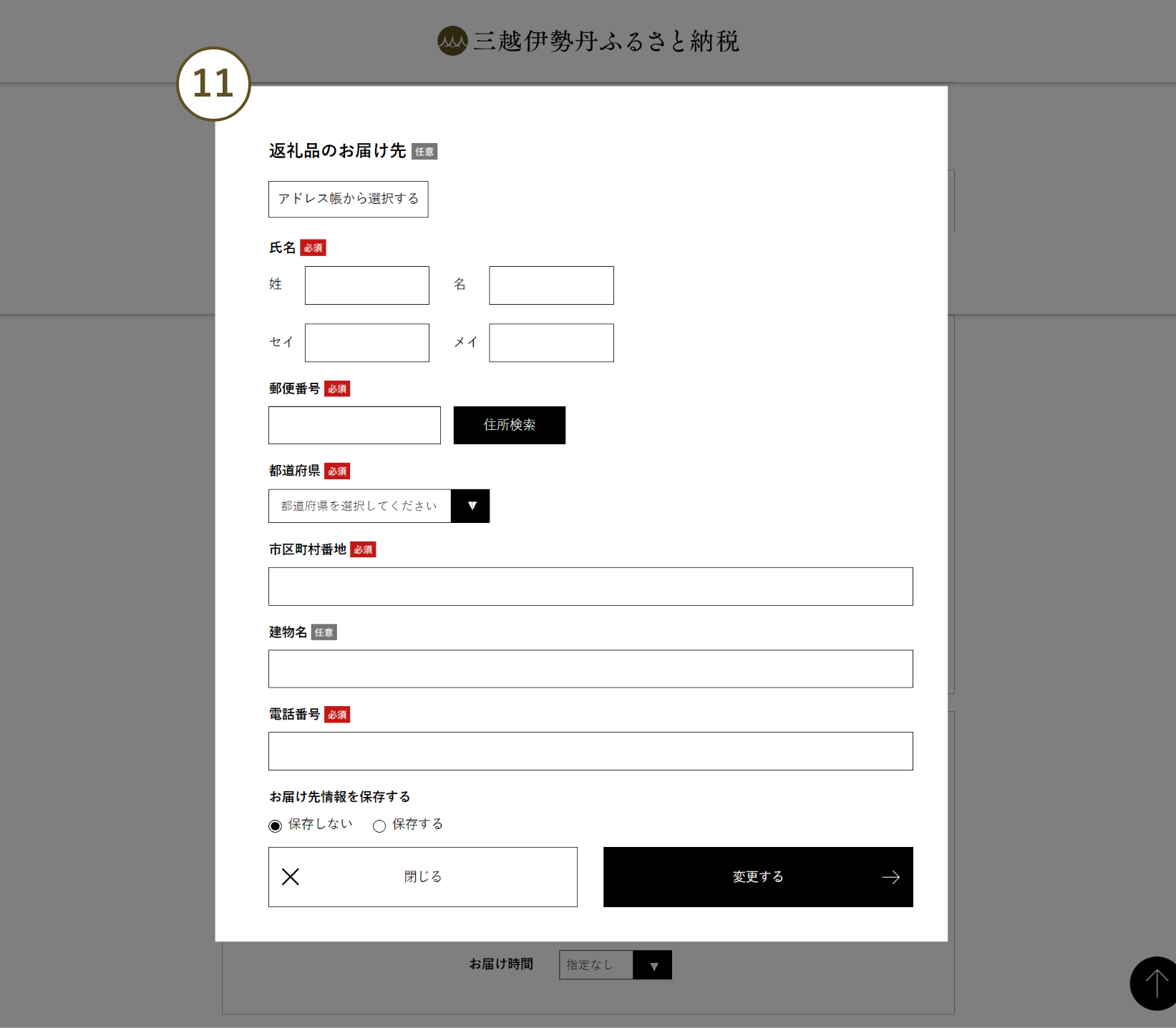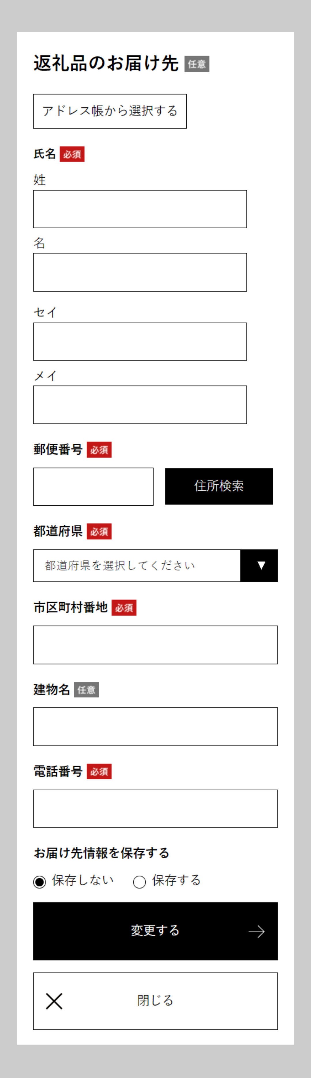 お届け先を変更したい場合は「寄附者住所以外にお届けする」にチェックを入れ、表示されるフォームにお届け先情報を入力の上、「変更する」ボタンをクリックしてください。