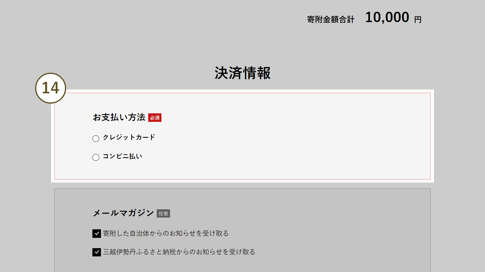 - 14 ご利用いただけるお支払方法のみが表示されます。クレジットカードは寄附者本人名義のカードのみがご利用いただけます。