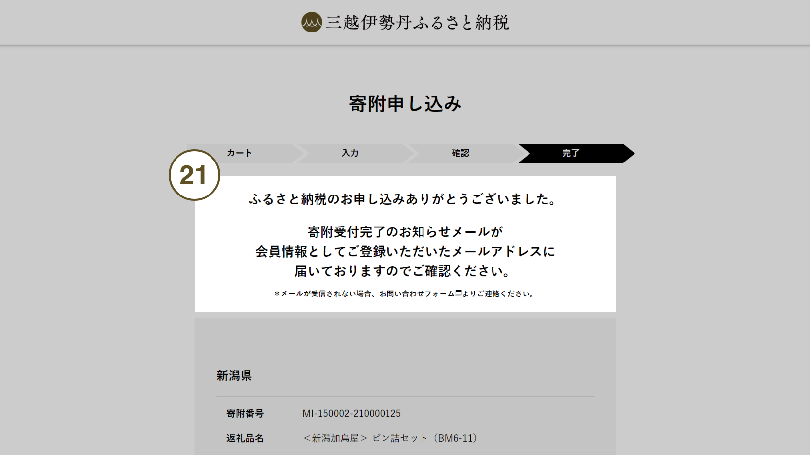 - 21 完了画面が表示されれば寄附の申し込みは完了です。会員情報としてご登録いただいたメールアドレスにお申し込み完了のメールが送信されます。