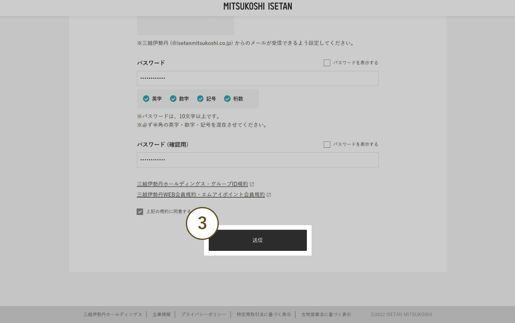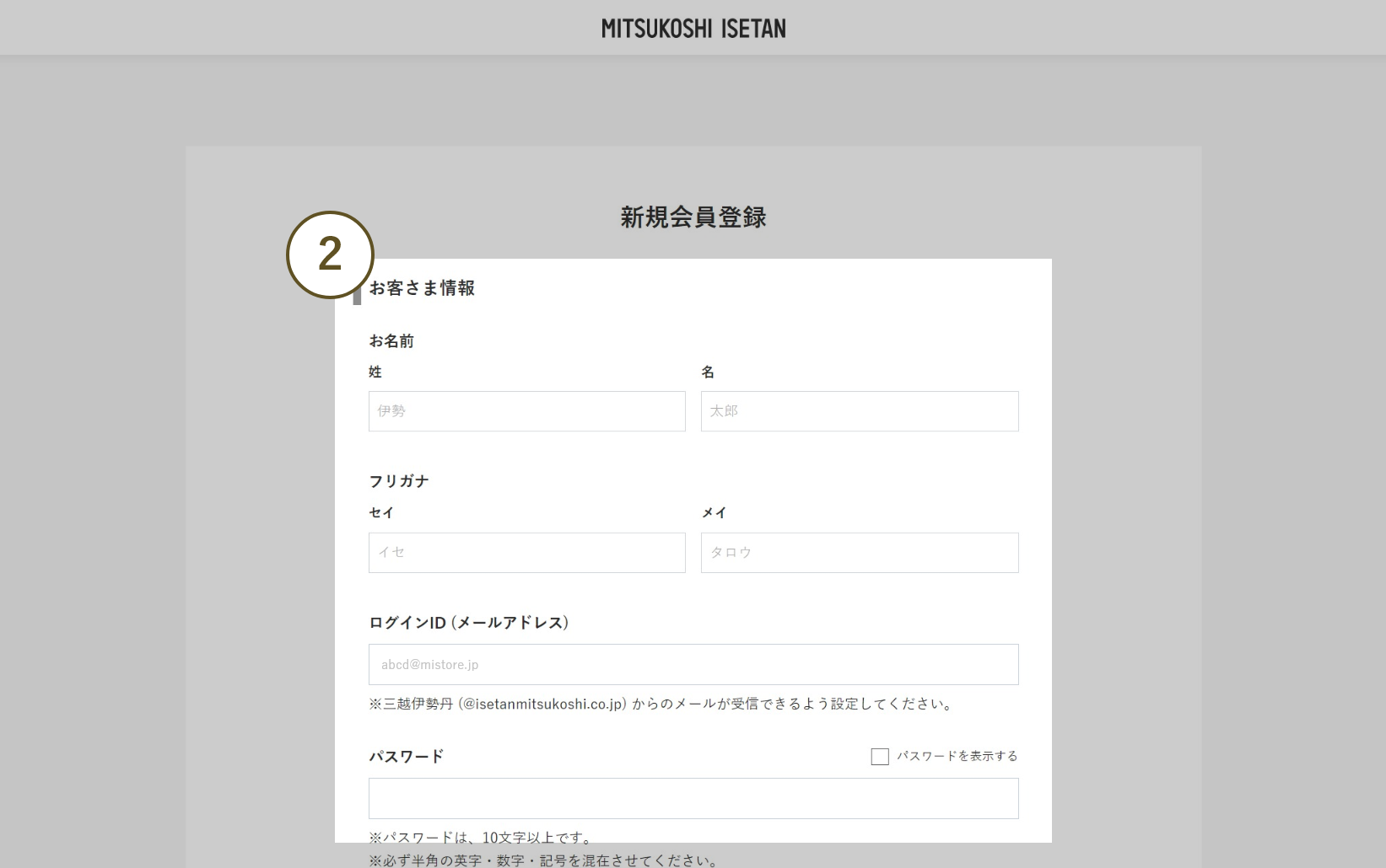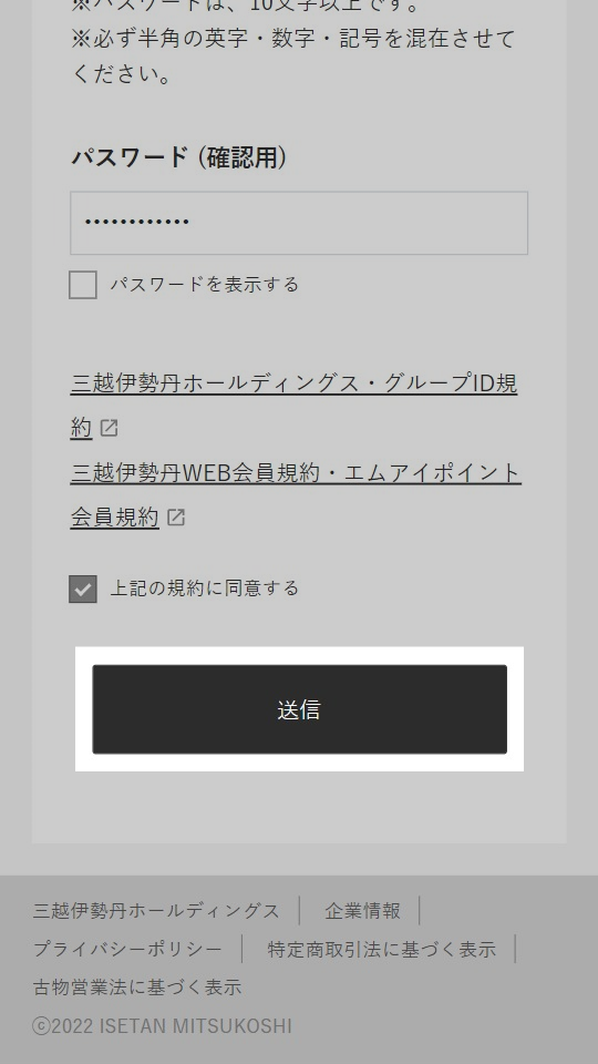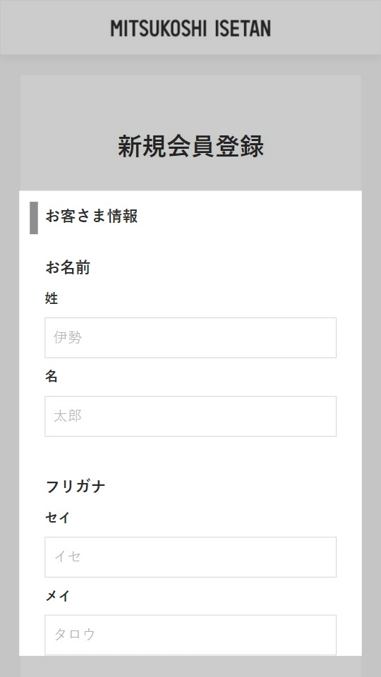 - 2 画面の表示に沿って氏名、ログインに使用するメールアドレス、パスワードを入力します。お知らせ送付の有無、利用規約についてもご確認ください。 ※三越伊勢丹グループWEB会員新規登録ページでの登録となります。