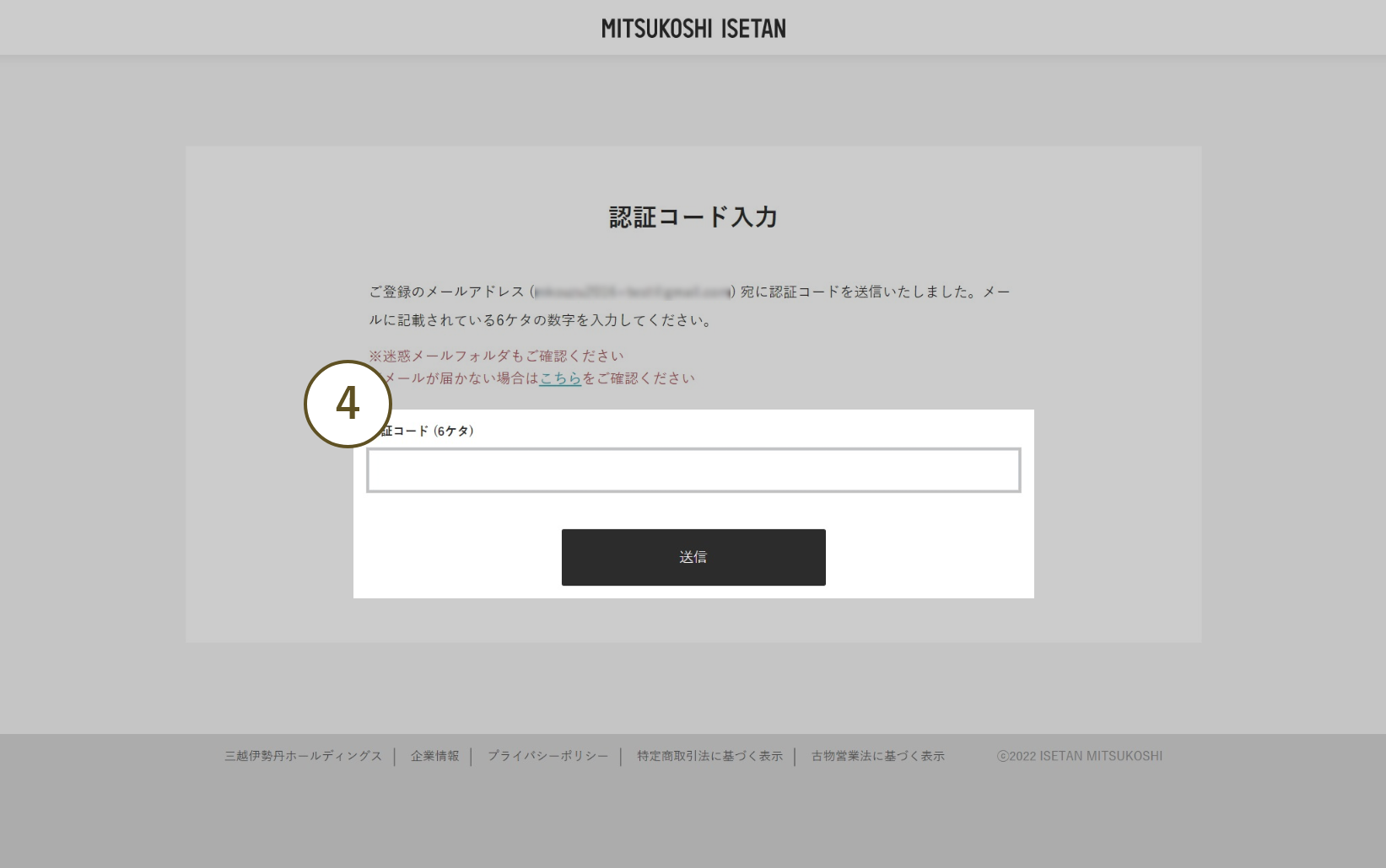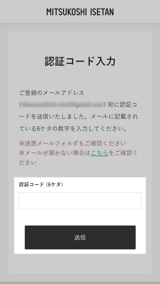 - 4 ②で入力したメールアドレス宛に6桁の「認証コード」が届きますので、届いたコードを入力し「送信」をクリックしてください。