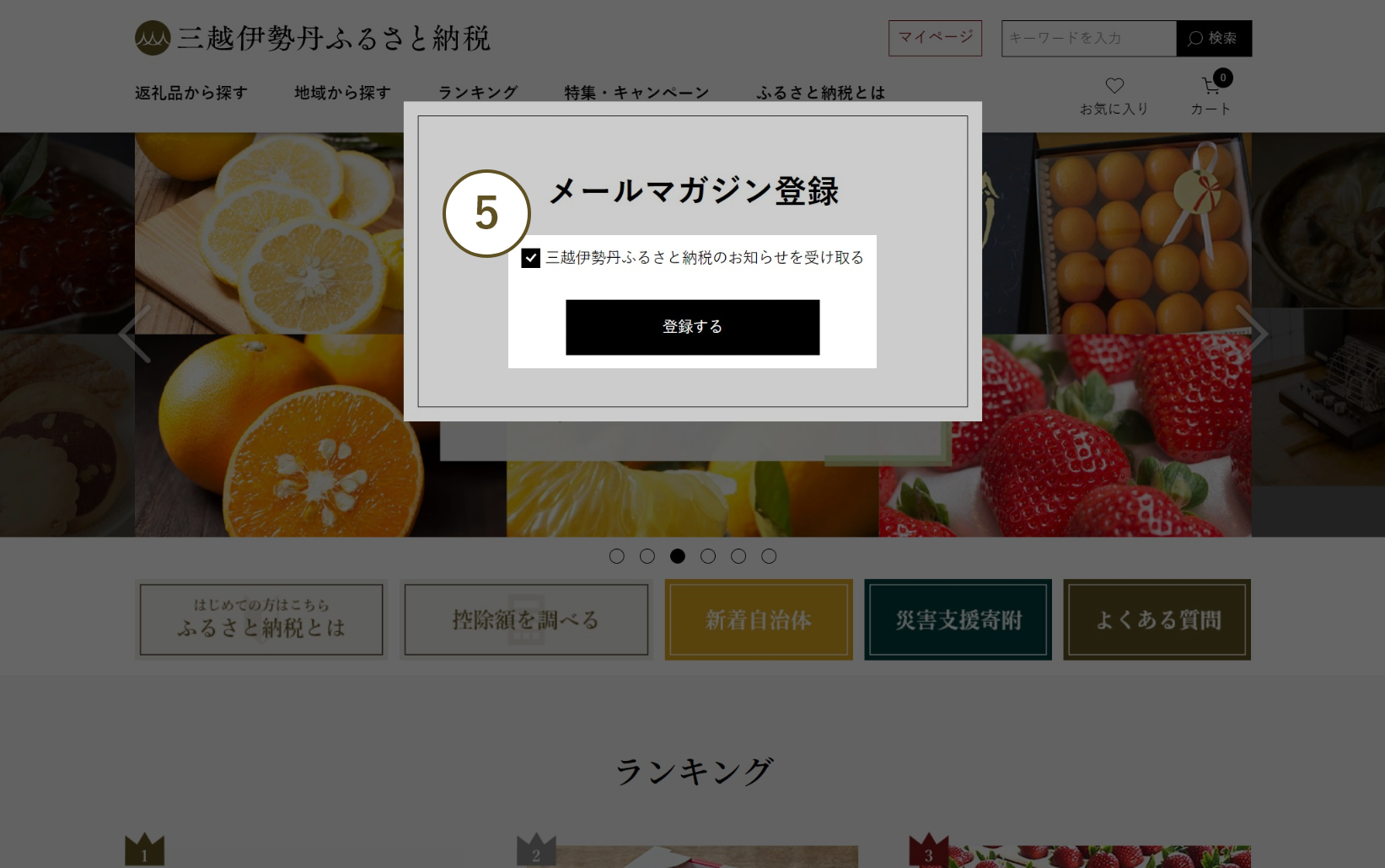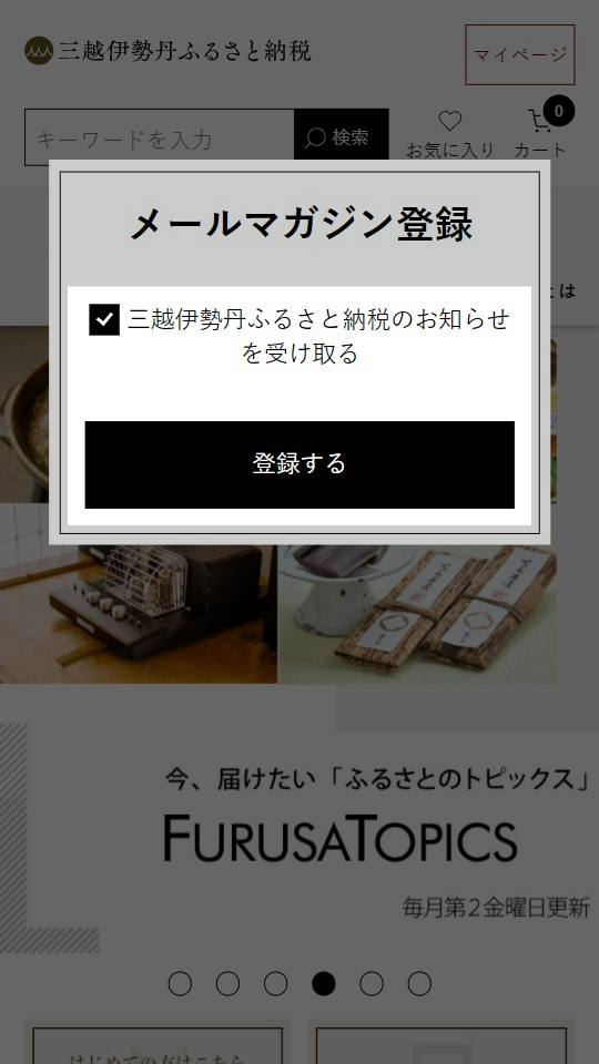 購読をご希望の場合は「三越伊勢丹ふるさと納税のお知らせを受け取る」にチェックが入った状態で「登録する」をクリックしてください。