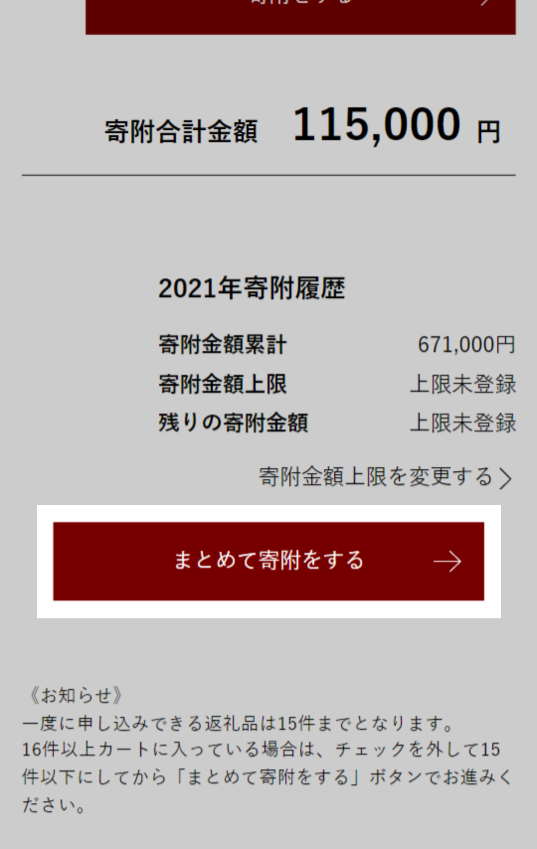 - 3 チェックがついているすべての返礼品について寄附申し込みを行う場合は、「まとめて寄附をする」ボタンをクリックしてください。