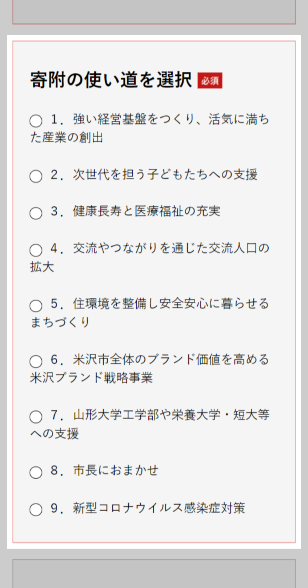 表示されている寄附の使い道のなかから