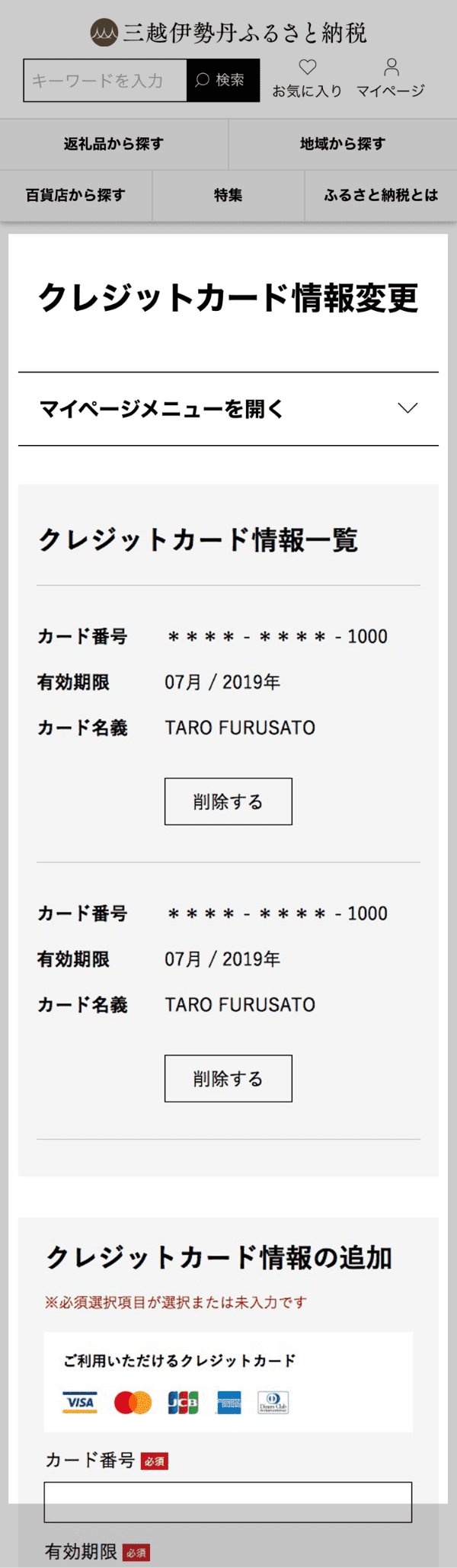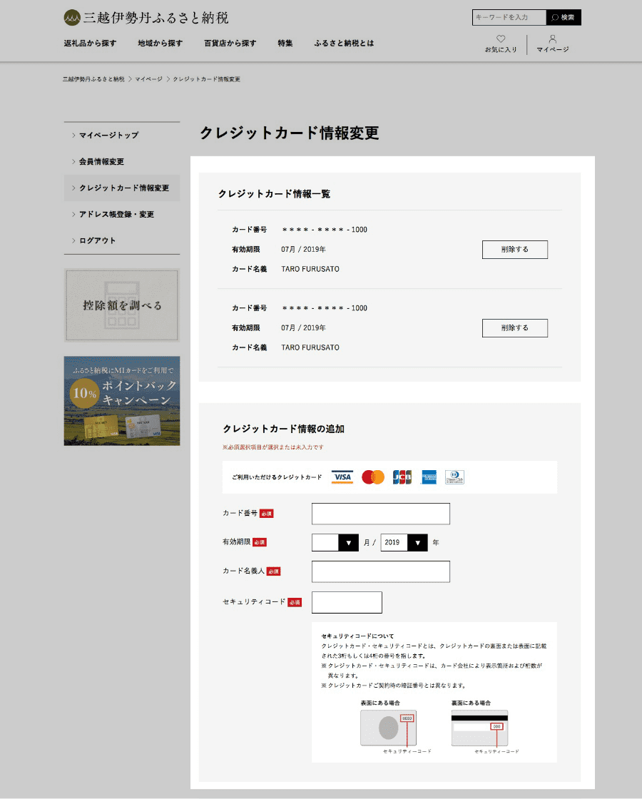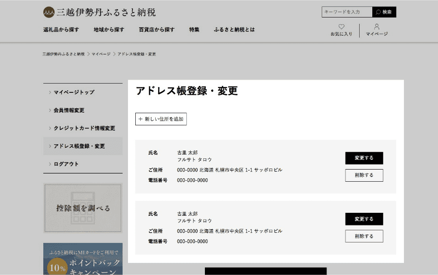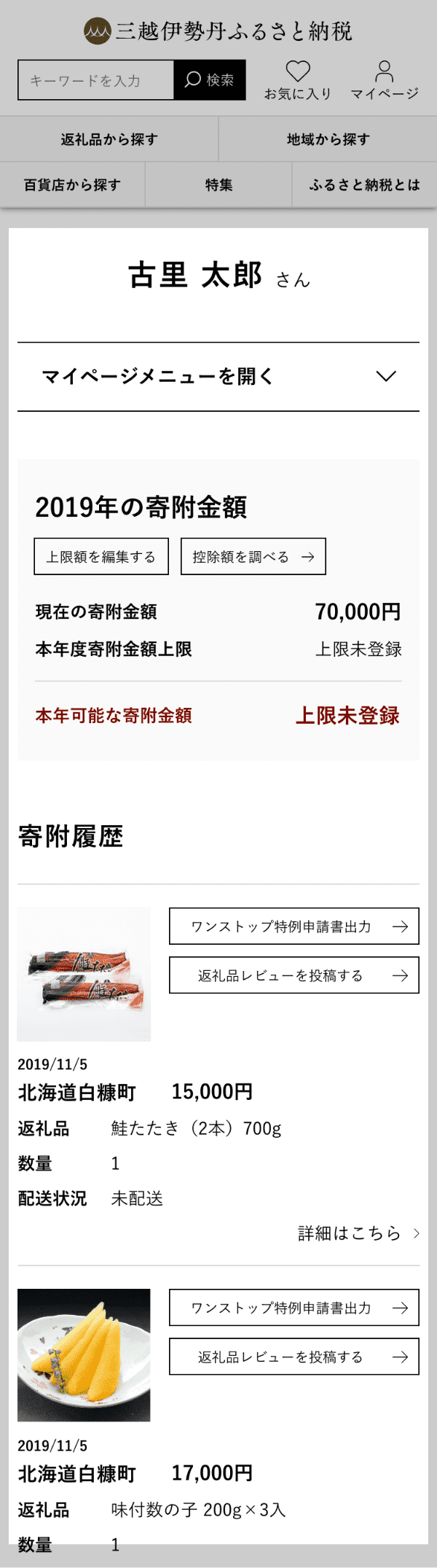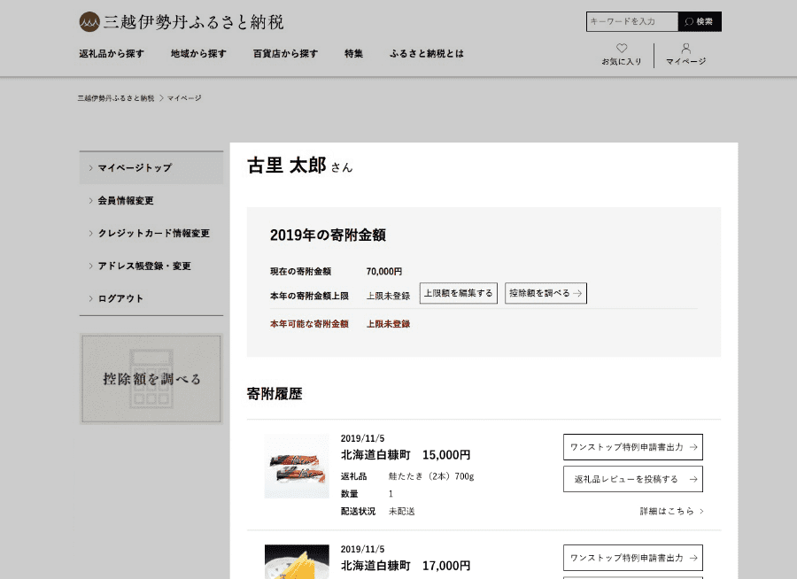 - これまでに申し込んだ寄附の履歴が表示されます。