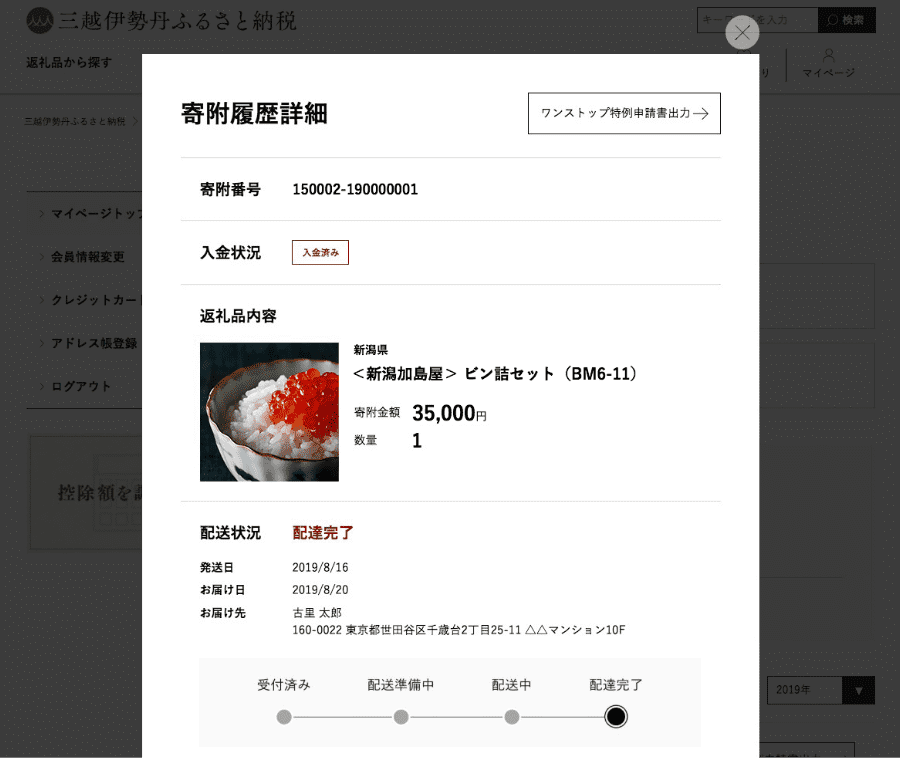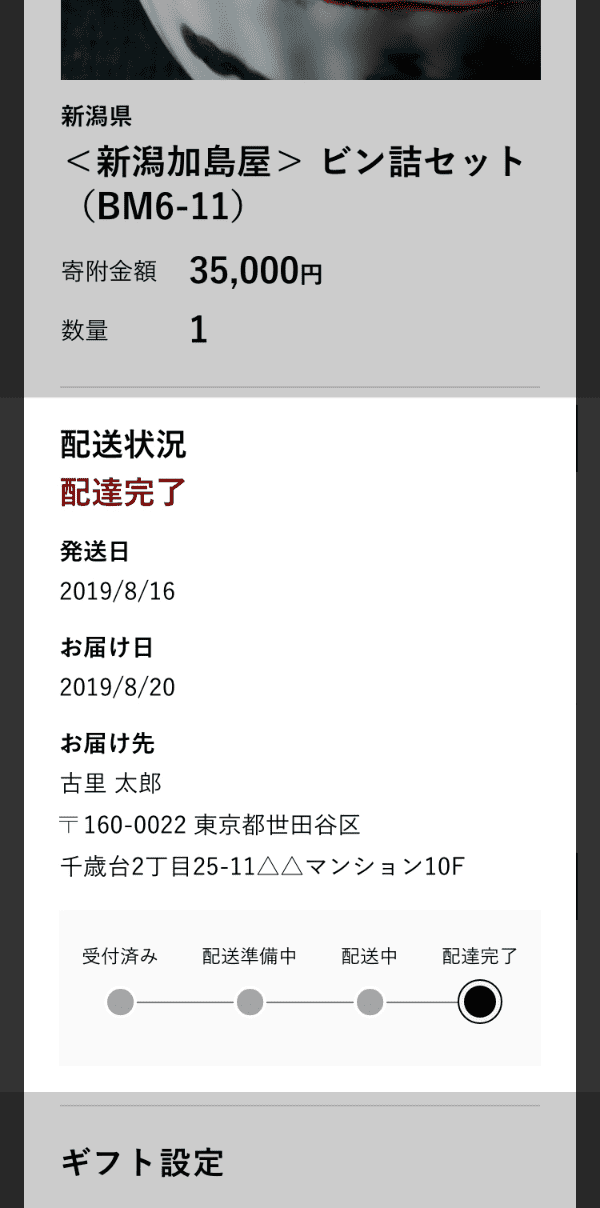 - 詳細画面では返礼品の準備/発送状況を確認することができます。