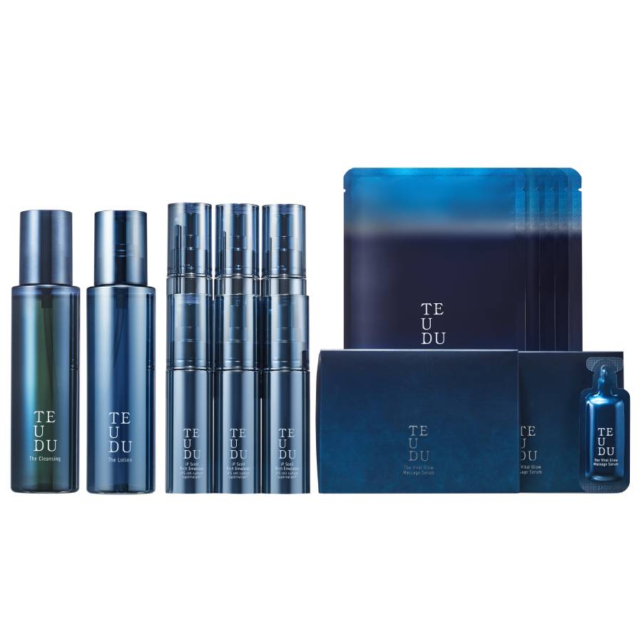 iPS細胞培養上清液由来の防腐剤不使用クリームをたっぷり6本と、バイオセルロース素材のシートマスク1箱、メイク落とし&洗顔オイル1本、ローション1本、マッサージセラム2箱の、美肌スパイラルを引き起こすTEUDU(テウズ)をじっくり堪能いただけるフルラインセット。