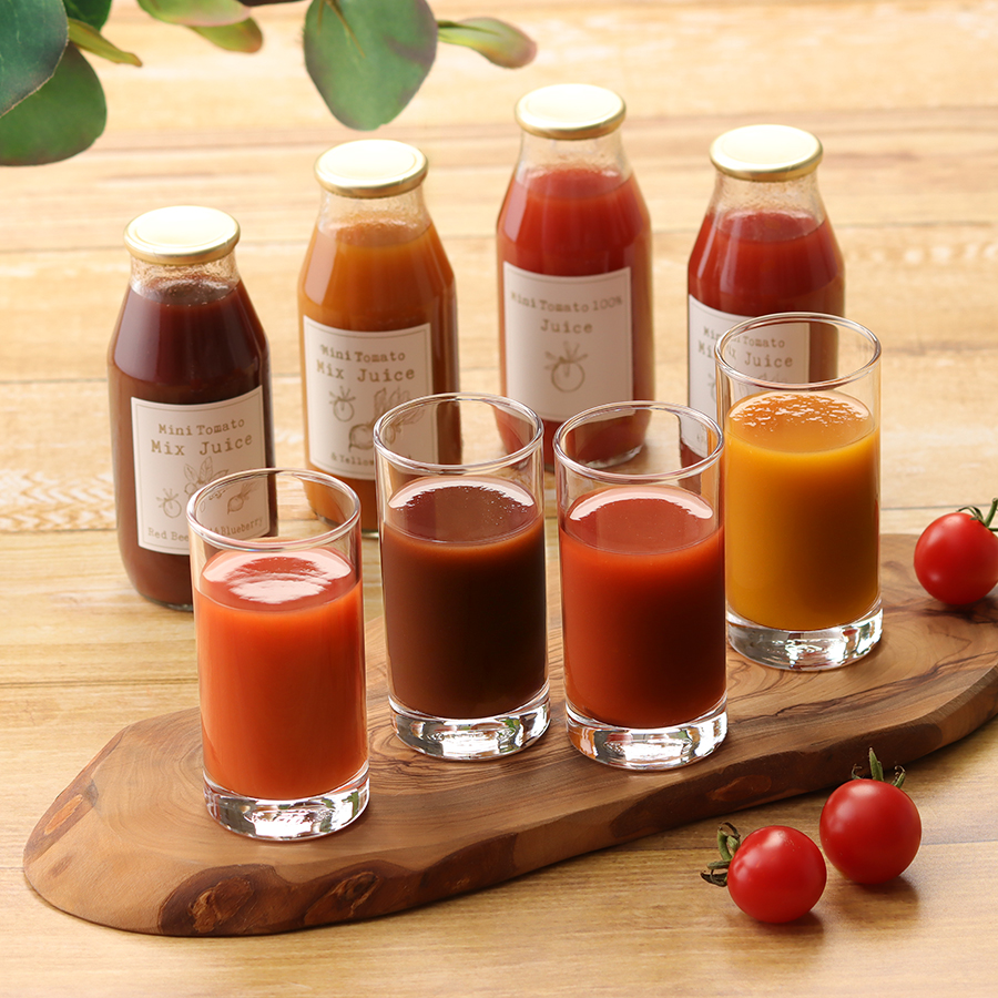 和寒町で大切に育てた有機ミニトマトを、それぞれの個性が際立つ4種類のジュースに仕上げました。