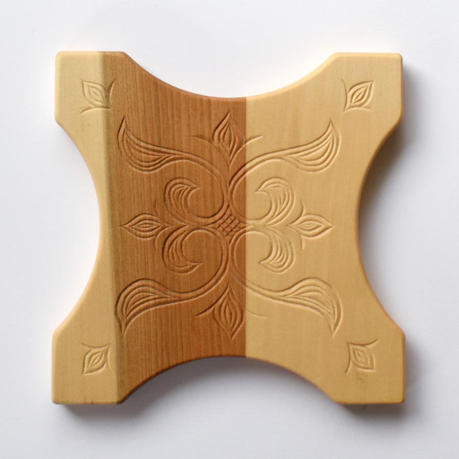 一つ一つ職人の手で丁寧に木彫りを施した鍋敷き。アイヌ文様の彫刻が食卓に華を添え、未使用時はキッチンのインテリアとしての美しい佇まいにもこだわりました。アイヌの伝統的な道具である「ヌイトサイェプ」という糸巻きを鍋敷きに見立ててリサイズし、テー ブルの上に置いても掴みやすい形状にしました。木彫りの手触りが感じられ、経年変化により味わい深く変化していく表情は、使うほどに愛着の沸く日常の道具となります。人間が作った道具であっても魂が宿ると考え大切に扱うアイヌのこころの豊かさを、ramguの道具を通じて感じていただけたら幸いです。