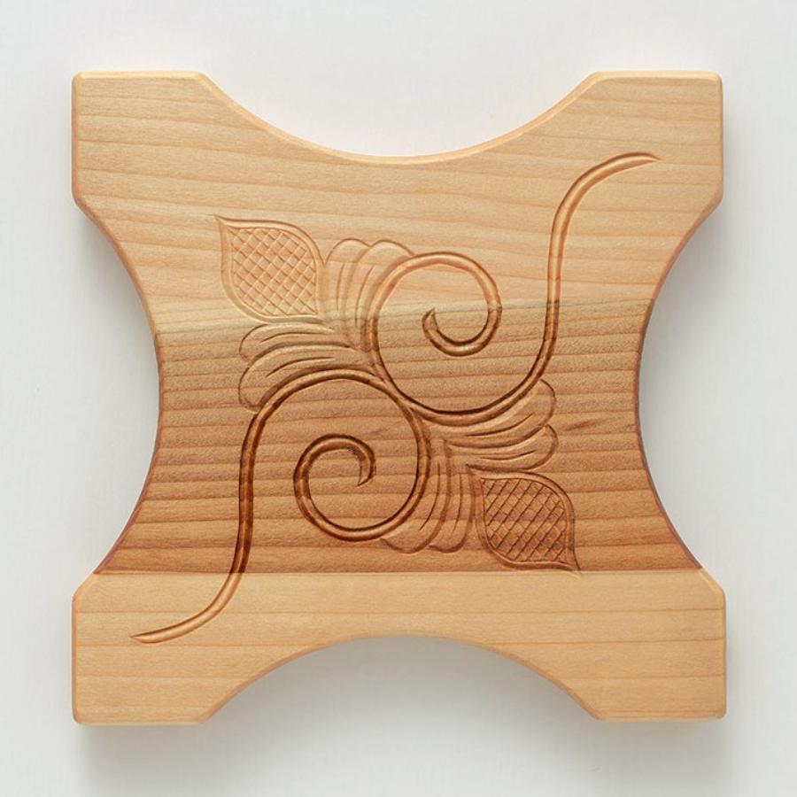 一つ一つ職人の手で丁寧に木彫りを施した鍋敷き。アイヌ文様の彫刻が食卓に華を添え、未使用時はキッチンのインテリアとしての美しい佇まいにもこだわりました。アイヌの伝統的な道具である「ヌイトサイェプ」という糸巻きを鍋敷きに見立ててリサイズし、テー ブルの上に置いても掴みやすい形状にしました。木彫りの手触りが感じられ、経年変化により味わい深く変化していく表情は、使うほどに愛着の沸く日常の道具となります。人間が作った道具であっても魂が宿ると考え大切に扱うアイヌのこころの豊かさを、ramguの道具を通じて感じていただけたら幸いです。