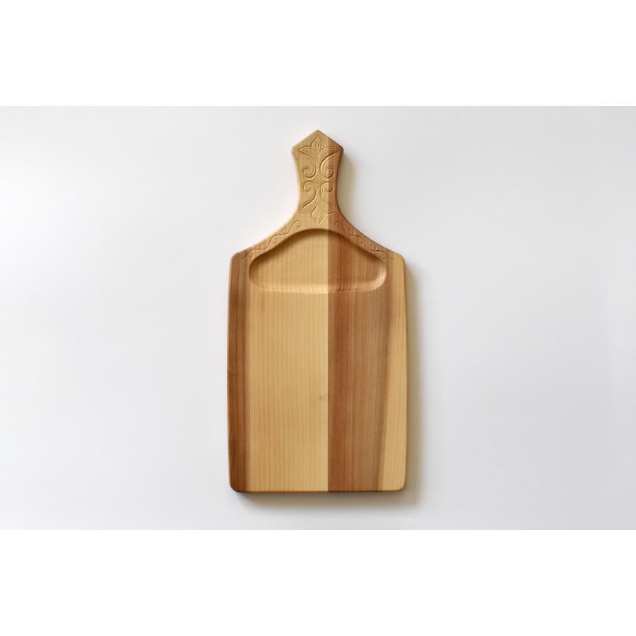 一つ一つ職人の手で丁寧に木彫りを施したカッティングプレート。アイヌ文様の彫刻が食卓に華を添え、未使用時はキッチンのインテリアとしての美しい佇まいにもこだわりました。アイヌの伝統的な道具である「メノコイタ」の要素を取り入れ、表面に凹みを作ることにより、まな板兼プレートとしての役割を果たします。握るたびに木彫りの手触りが感じられ、経年変化により味わい深く変化していく表情は、使うほどに愛着の沸く日常の道具となります。人間が作った道具であっても魂が宿ると考え大切に扱うアイヌのこころの豊かさを、ramguの道具を通じて感じていただけたら幸いです。