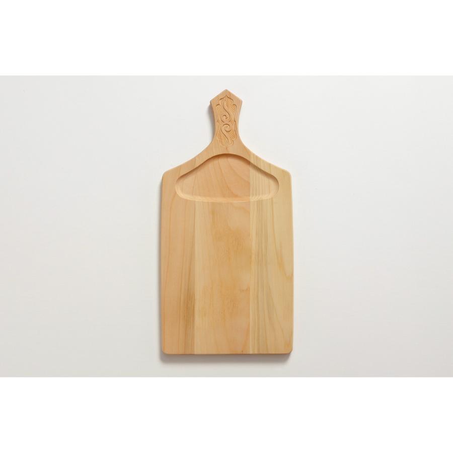 一つ一つ職人の手で丁寧に木彫りを施したカッティングプレート。アイヌ文様の彫刻が食卓に華を添え、未使用時はキッチンのインテリアとしての美しい佇まいにもこだわりました。アイヌの伝統的な道具である「メノコイタ」の要素を取り入れ、表面に凹みを作ることにより、まな板兼プレートとしての役割を果たします。握るたびに木彫りの手触りが感じられ、経年変化により味わい深く変化していく表情は、使うほどに愛着の沸く日常の道具となります。人間が作った道具であっても魂が宿ると考え大切に扱うアイヌのこころの豊かさを、ramguの道具を通じて感じていただけたら幸いです。