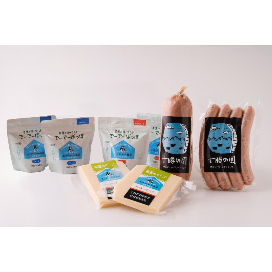 | 内容量 | 草原のヨーグルトでーでぽっぽ:300g(プレーン/セミスイート)各2個 チェダーチーズ90g×2 ポークソーセージ160g×1 ビアシンケン250g×1 |