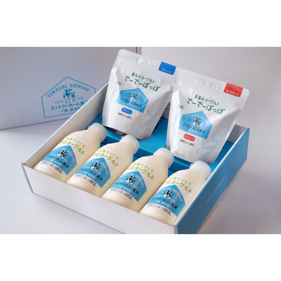 | 内容量 | 草原のヨーグルトでーでぽっぽ:300g(プレーン/セミスイート)各1個 牧場てづくりのむヨーグルト500g×4本 |