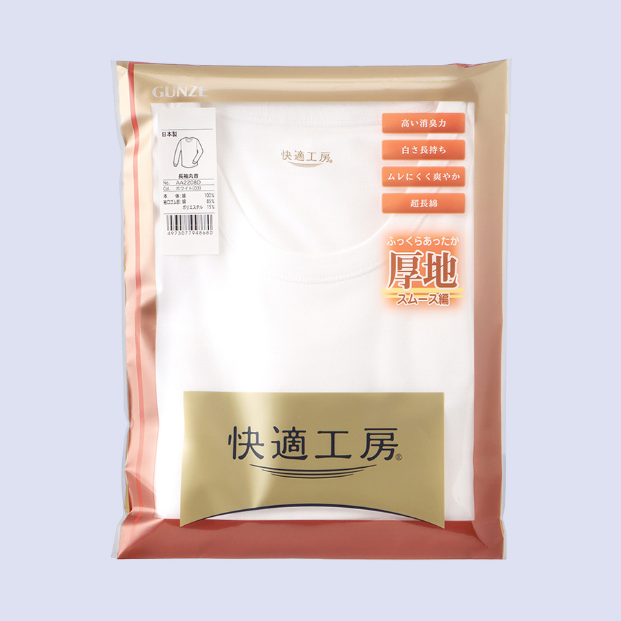 グンゼ<快適工房>の高品質ラインです。特殊なコンパクトスピン製法を採用しており、綿のケバを抑え、肌ざわりがよく、生地表面も滑らかで光沢のある仕上がりとなっております。