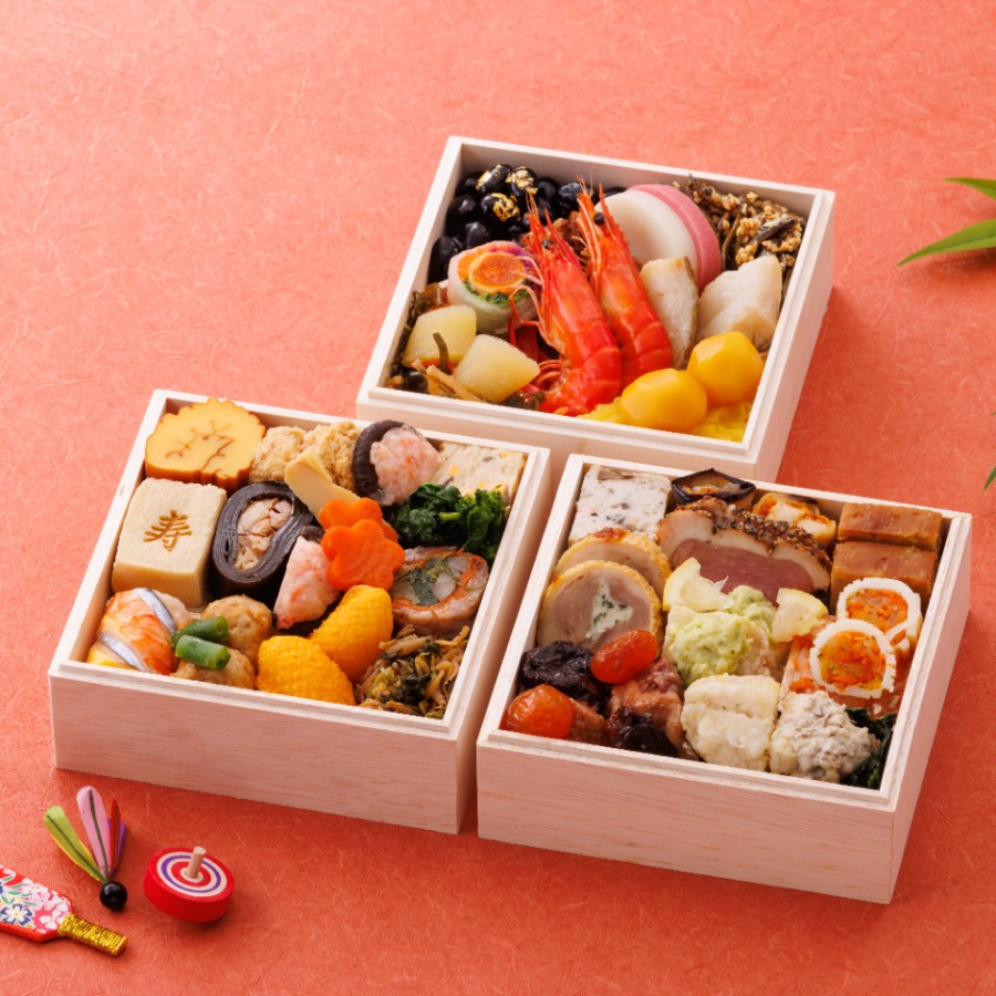 金箔黒豆/アーモンド入り田作り/栗きんとん(甘露栗2個)/数の子入り松前漬/紅白かまぼこ/カラスガレイ西京焼/浜汐えび/彩りきぬた巻/くるみのかつお和え