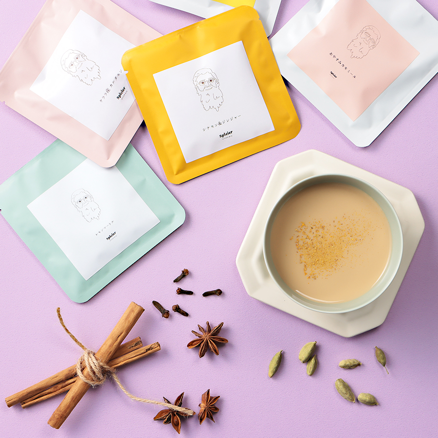 「シナモン・ジンジャー」、「ケララ産カルダモン」、「レモンマートル」、「ターメリック・ジンジャー」、「カモミール」の5種類の詰め合わせが2セット入っています。