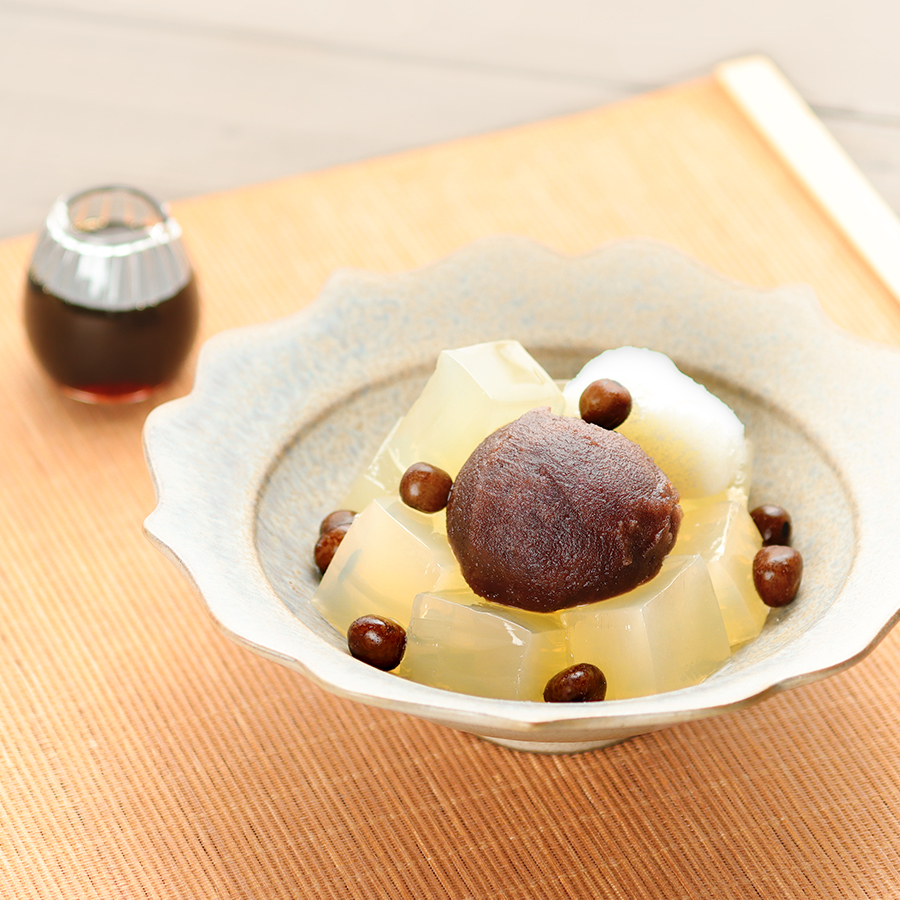 | 内容量 | 寒天(600g)×1袋 こし餡(300g)×1袋 求肥餅(110g)×1個 黒蜜(130ml)×1袋 赤えんどう豆(50g)×1個 |