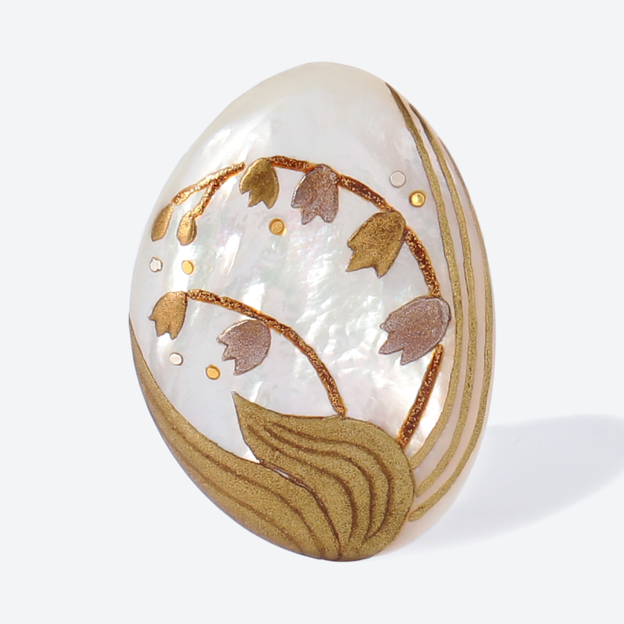 優しく可愛らしいスズランの意匠がアシンメトリーに整形された白蝶貝の輝きに写り、さりげないワンポイントとして重宝しそうです。