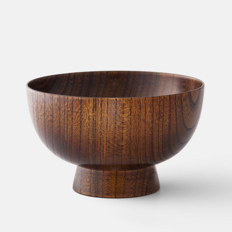 漆と最も相性の良いケヤキの天然木を削り出し、その伸びやかな木目を活かす拭き漆塗で仕上げています。使い勝手について検証を重ね美しさを追求したかたちで、手に心地よく収まる軽さ、指をかけやすい少し深めの高台、やわらかな口あたりが特徴です。