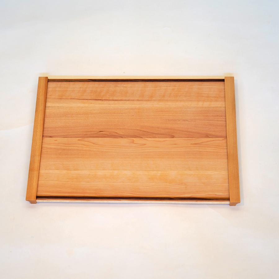 金具を使わない「追い入れ」で仕上げ、持ち手の持ちやすさや立ち上がりの高さ、ちょうど良いサイズ感など、細かな使い心地にもこだわったお膳です。エンジュ材をラインのアクセントに使用しました。