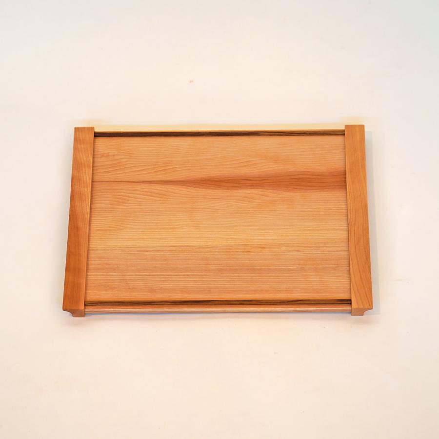 金具を使わない「追い入れ」で仕上げ、持ち手の持ちやすさや立ち上がりの高さ、ちょうど良いサイズ感など、細かな使い心地にもこだわったお膳です。エンジュ材をラインのアクセントに使用しました。