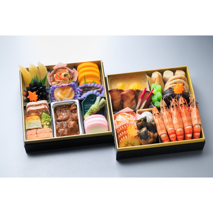 | 内容量 | 錦玉子(国内製造)、栗きんとん、海老甘煮、ビーフシチュー、鮪昆布巻き、蓮根煮、鰤照り焼、伊達巻き、紅白蒲鉾、里芋煮、蒟蒻煮、なます、黒豆、椎茸煮、筍煮、蕗煮、大地のハーブ鶏と野菜の南蛮漬、数の子、野菜三色テリーヌ、チーズ入りミートテリーヌ、スモークサーモンすり身蒸し、イカ黄金和え、手まり餅、ロマネスコブロッコリー、生山葵、田作り、紅葉人参、酢取生姜 |
