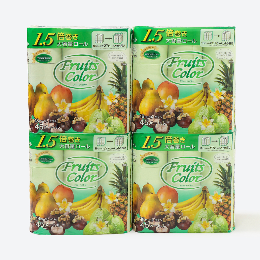 鶴見製紙株式会社が製造するトイレットペーパー『フルーツカラー18ロールトロピカルフルーツ』の4パックセットです。