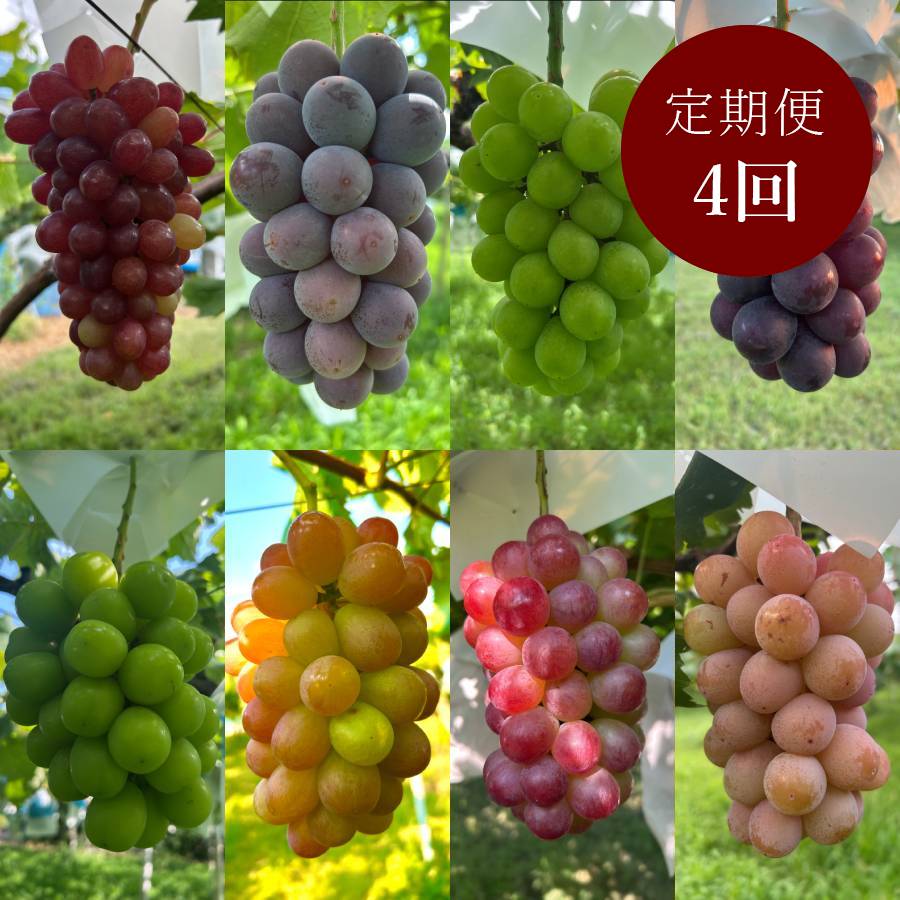 | 内容量 | ぶどう8種類 【1回目】「巨峰・クイーンセブン」各1房(計2房) 【2回目】「黄玉・ブラックビート」各1房(計2房) 【3回目】「シャインマスカット・スカーレット」各1房(計2房) 【4回目】「コトピー・クイーンニーナ」各1房(計2房) |