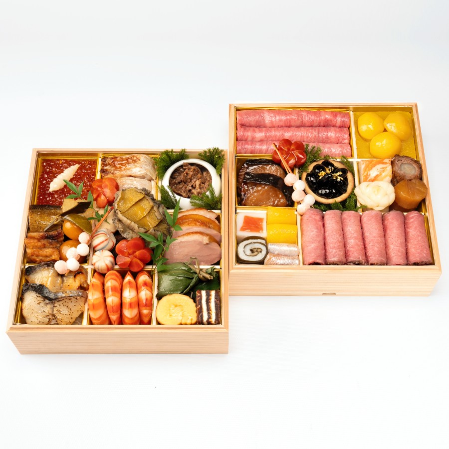 原材料 | <一の重> 甘鯛柚庵焼き(アマダイ(国産)、みりん、醤油、清酒、食塩、ゆず)、いくら醤油漬け[鮭卵、調味たれ(醤油、粉末水あめ、米発酵調味料、砂糖)、食塩]、鰆西京焼き(サワラ、味噌、みりん、清酒、食塩)、鴨のロースト(合鴨肉、食塩、砂糖、ホワイトペッパー)、車海老艶煮(車えび、清酒、みりん、醤油、粉末だし)、オレンジ蜜煮(オレンジ、砂糖)、竹の子旨煮(竹の子、砂糖、醤油、果糖ぶどう糖液糖、かつお節調味エキス、清酒、食塩、かつお風味調味料)、あわび柔らか煮(あわび、昆布出汁、清酒、食塩、もち米エキス)、子持ち鮎甘露煮(アユ、砂糖、醤油、水あめ、茶葉)、椎茸旨煮(椎茸、砂糖、醤油、果糖ぶどう糖液糖、かつお節調味エキス、清酒、食塩、かつお風味調味料)、葉つき金柑蜜煮(金柑、砂糖)、笹麩茶巾(ゆず味噌あん、小麦たんぱく、もち米粉、砂糖、麦芽糖、よもぎ)、伊達巻(鶏卵、砂糖、魚肉、還元水あめ、植物油脂、小麦粉、砂糖混合ぶどう糖果糖液糖、みりん、ぶどう糖、食塩)、穴子山椒焼き(アナゴ、醤油、みりん、清酒、砂糖、山椒パウダー)、牛肉しぐれ煮(牛肉、醤油、砂糖、はちみつ、合成清酒、酵母エキスパウダー)、柿博多(干柿、マーガリン)、梅花人参煮(人参、みりん、醤油、砂糖、調味梅干し、粉末だし)、里芋六方旨煮(里芋、砂糖、醤油、果糖ぶどう糖液糖、かつお節調味エキス、清酒、食塩、かつお風味調味料)、数の子西京漬け(ニシンの卵、調合味噌、砂糖、料理酒、みりん、唐辛子)、てまり麩[生麩(小麦グルテン、もち米粉)、砂糖、食塩]、艶だし調味料(還元水あめ、食塩)、しだれ華餅(上用粉、砂糖、麦芽糖、もち粉)、ちょろぎ漬け(ちょろぎ、食塩)/調味料(アミノ酸等)、ソルビット、加工デンプン、pH調整剤、リン酸塩(Na)、トレハロース、酒精、増粘剤(増粘多糖類、加工デンプン)、酸化防止剤(V.C)、酢酸Na、保存料(ポリリジン、ソルビン酸K)、酸味料、アジピン酸、トウガラシ抽出物、酵素、香料、着色料(黄4、青1、カラメル、カロチン、クチナシ、紅麹、野菜色素)、乳化剤、発色剤(亜硝酸Na、硝酸K)、チアミン、リボフラビン、甘味料(カンゾウ、ステビア)、漂白剤(亜硫酸塩)、(一部にえび・小麦・卵・乳成分・あわび・いくら・オレンジ・牛肉・さば・大豆・豚肉・ゼラチンを含む) <二の重> ローストビーフ(牛肉(国産)、食塩、ぶどう糖、香辛料)、栗きんとん[さつま芋あん(さつま芋ペースト、砂糖、白生あん、水あめ、みりん風調味料、食塩)、栗甘露煮]、銀だら仙台味噌焼き(ギンダラ、みりん、味噌、砂糖、醤油、清酒)、黒豆蜜煮(黒大豆、砂糖、還元水あめ、食塩)、牛肉八幡巻(牛肉、ごぼう、醤油、砂糖、みりん、粉末だし)、蟹真丈(かに、魚肉すり身、昆布出汁、かに加工品、でん粉、植物油脂、卵黄、味噌)、龍皮巻[カレイ、龍皮昆布(昆布、砂糖、醸造酢)、しょうが漬け、醸造酢、砂糖、米発酵調味料、食塩]、帆立しぐれ煮(ほたて貝柱、みりん、清酒、醤油、しょうが、砂糖)、紅鮭小川巻(いか、紅鮭、醸造酢、砂糖、食塩、調味酢、オニオンエキスパウダー、人参エキスパウダー)、花百合根蜜煮(百合根、砂糖)、網み笠柚子(ゆず皮、砂糖)、小鯛笹漬け(キダイ、醸造酢、砂糖、砂糖混合ぶどう糖果糖液糖、水あめ、醤油、食塩、昆布エキス)、梅花人参煮(人参、みりん、醤油、砂糖、調味梅干し、粉末だし)、艶だし調味料(還元水あめ、食塩)、しだれ華餅(上用粉、砂糖、麦芽糖、もち粉)/ソルビット、調味料(アミノ酸等)、酒精、pH調整剤、加工デンプン、酸味料、酢酸Na、増粘剤(キサンタン)、着色料(黄4、クチナシ、金箔、紅麹、野菜色素)、グリシン、酸化防止剤(V.C、EDTA-Ca・Na、V.E)、乳化剤、酵素、くん液、チアミン、トウガラシ抽出物、リン酸塩(Na)、重曹、漂白剤(亜硫酸塩)、硫酸鉄、(一部にかに・小麦・卵・乳成分・いか・牛肉・さけ・さば・大豆を含む) |
