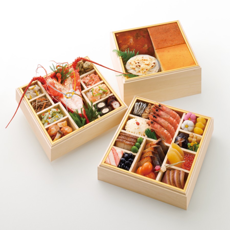 | 原材料 | 牛ほほ肉の赤ワインブレゼ(牛肉、デミグラスソース、赤ワイン、玉葱、その他)(国内製造)、伊勢海老ワイン蒸し、コーヒーチーズケーキ、チーズケーキ、鰤の”福和蔵純米吟醸酒”粕漬け、鮑グラタン(鮑、牛乳、玉葱、その他)、海老の艶煮、鱧の南蛮漬け、紅ズワイガニのテリーヌ、あかもくつみれ、黒糖ボイルドポーク、クリームチーズ柚子風味、数の子、椎茸煮、ディル香るサーモンとリコッタチーズのタルタル(サーモン、リコッタチーズ、その他)、栗きんとん、帆立とエリンギのプロヴァンス風(帆立、エリンギ、トマトソース、その他)、紅茶鴨のロース、烏賊のジェノベーゼ(イカ、バジルペースト、オリーブオイル、その他)、美熊野牛のしぐれ煮赤ワイン風味、鰆の昆布巻、蛸の柔ら煮、きんかん、白梅餅、真鯛のあぶり柚の香り、丹波黒豆ブランデー風味、いくら、紅白なます、ごま胡桃、たたき牛蒡、若桃蜜煮、紅梅餅、田作り、山くらげ菊花和え、紅白梅松葉/調味料(アミノ酸等)、酸味料、アルコール、香料、保存料(安息香酸Na)、ソルビット、酸化防止剤(亜硫酸塩、V.C、EDTA-Ca・Na)、着色料(カラメル、ウコン、カロチノイド、クチナシ、コチニール、銅葉緑素、紅麹)、糊料(加工デンプン、増粘多糖類)、pH調整剤、乳化剤、酒精、甘味料(甘草、ソルビット)、漂白剤(亜硫酸塩)、発色剤(亜硫酸Na)、クエン酸K、シリコーン、セルロース、酢酸Na、酵素、硫酸第一鉄、トレハロース、ミョウバン、(一部にえび・かに・くるみ・小麦・卵・乳成分を含む) |