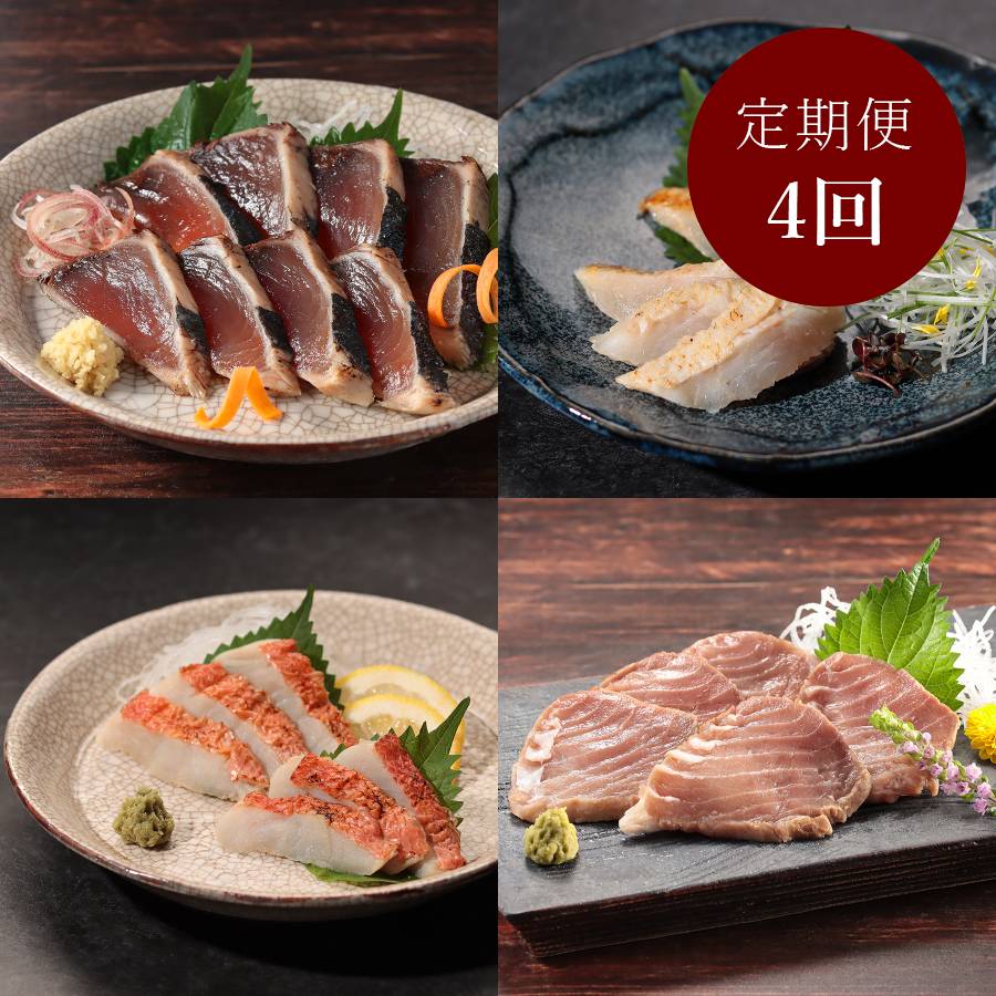 | 内容量 | 【1回目】 <紀伊長島>「鰹」たたき(スライス済) 100gx3(計300g) 【2回目】 <紀伊長島>「のどぐろ」炙り刺身(スライス済) 60gx2(計120g) 【3回目】 <紀伊長島>「金目鯛」炙り刺身(スライス済) 80gx2(計160g) 【4回目】 <紀伊長島>「本鮪」炙り中トロ(スライス済) 100gx2(計200g) |