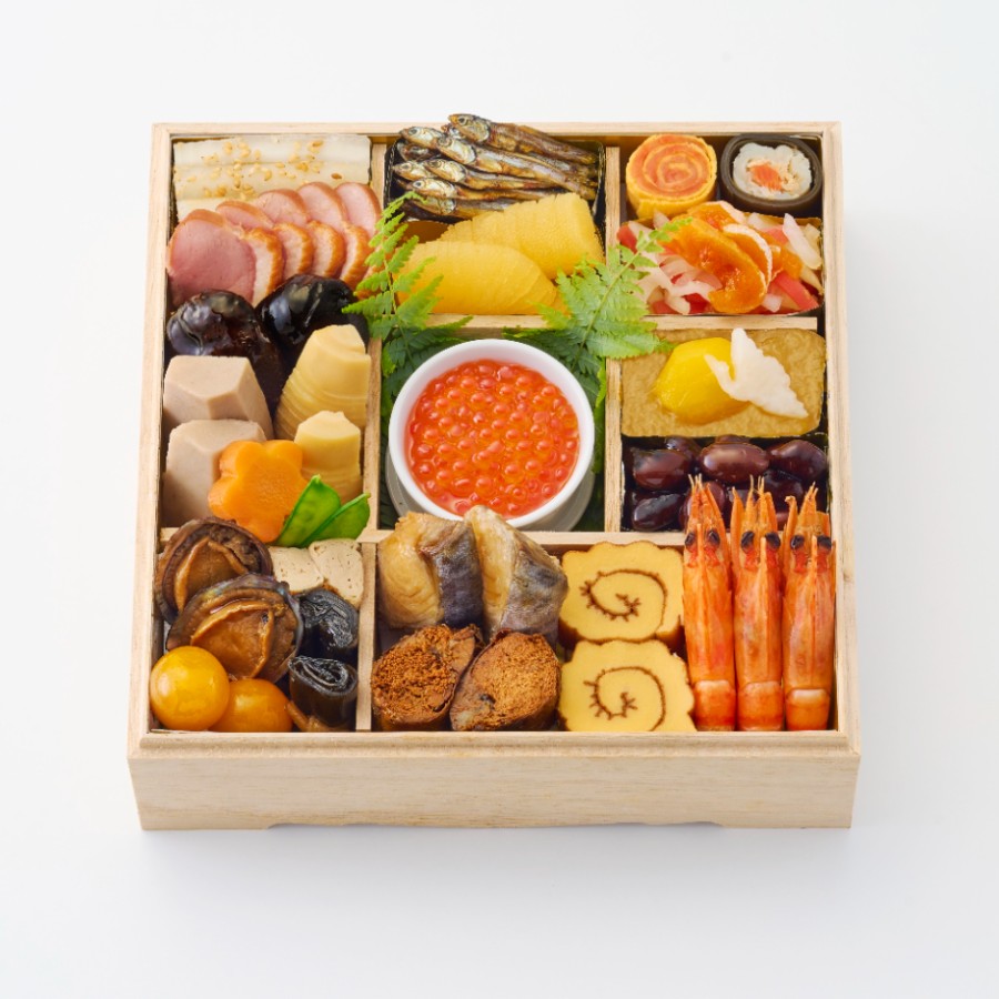 | 原材料 | 栗きんとん(国内製造)、海老煮、合鴨肉スモーク、海老芋煮、子持ち鮎甘露煮、伊達巻、たたきごぼう、柿なます(なます(大根、甘酢、人参、食塩)、柿)、黒豆煮、いくら醤油漬け、筍土佐煮、さわら柚庵焼、あわび旨煮、味付け数の子、田作り(片口いわし、水飴、醤油、砂糖、その他)、鮭年輪巻(スモークサーモンシート、錦糸玉子シート)、日の出龍飛巻(鯛、昆布、鮭、その他)、椎茸煮、湯葉煮、昆布巻、金柑甘煮、人参煮、きぬさや煮、かぶら酢漬/調味料(アミノ酸等)、酸味料、乳化剤、漂白剤(次亜硫酸Na)、増粘多糖類、リン酸塩(Na)、発色剤(亜硝酸Na)、加工デンプン、酸化防止剤(ビタミンC、チャ抽出物)、ソルビット、クチナシ色素、酵素、(一部に卵・乳成分・小麦・えび・あわび・いくら・ごま・さけ・さば・大豆・ゼラチンを含む) |